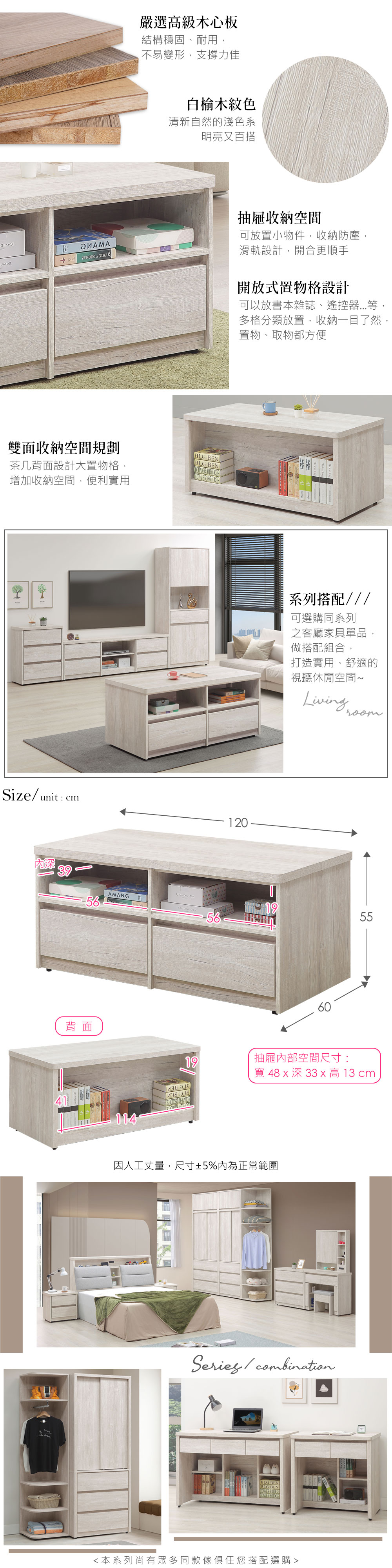 ◆木心板材質,堅實、穩固、耐用◆清新淺色系,質感木紋路視覺◆無把手設計,極簡美觀◆抽屜設計,能放各式小物,收納防塵◆開放置物格,可放書本、雜誌◆免組裝,由專人宅配到府尺寸:寬 120 x 深 60 x 高 55 公分材質:高級木心板顏色:白榆木色產地:台灣誤差值:因人工丈量,尺寸±5%內為正常範圍