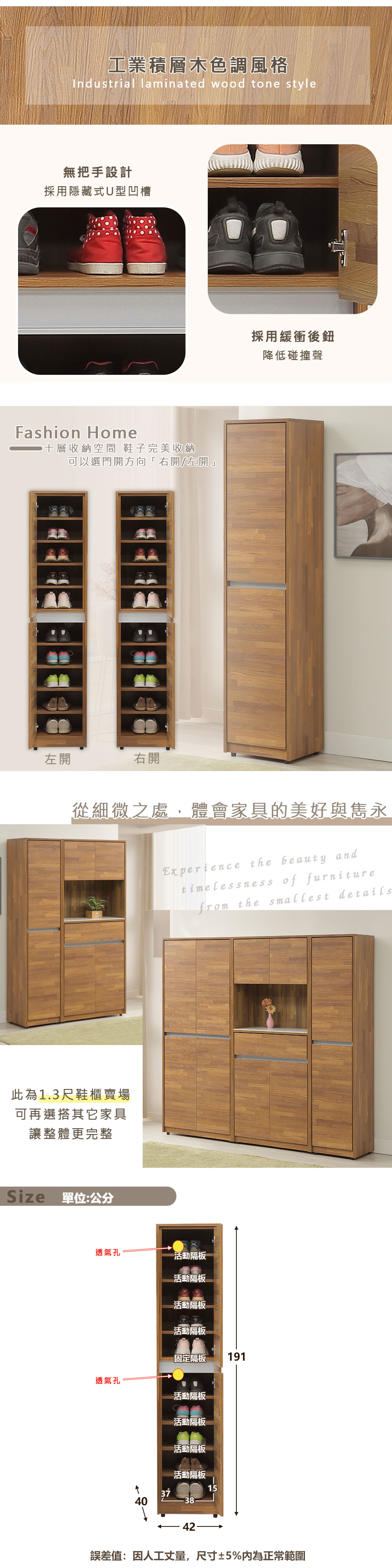 ◆無把手設計,採用隱藏式U型凹槽◆採用緩衝後鈕,降低碰撞聲◆工業積層木色調風格◆安心配送,由專人到府組裝尺寸:寬 42 x 深 40 x 高 191 公分材質:高級木心板顏色:積層木色產地:台灣誤差值:因人工丈量,尺寸±5%內為正常範圍