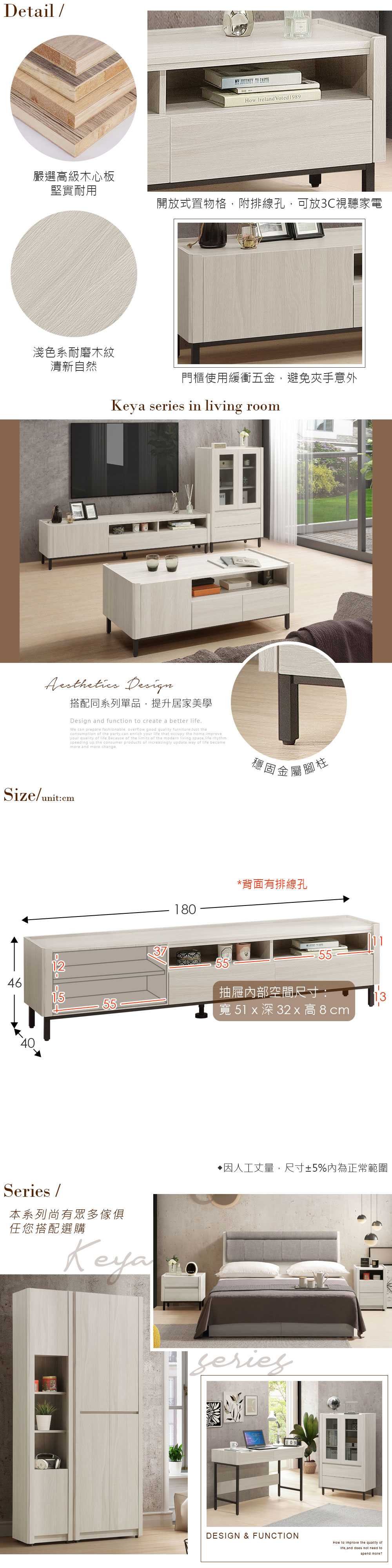 ◆木心板材質,堅實、穩固、耐用◆清新淺色系,質感木紋路視覺◆木質+金屬異材質結合,北歐、輕工業風◆檯面做凹槽圍欄設計,避免物品掉落◆門櫃+抽屜+置物格的大容量收納組合◆門片使用緩衝五金,開合安全、避免夾手◆電視櫃附排線孔,可放3C視聽家電◆免組裝,專人配送到府電視櫃尺寸:寬 180 x 深 40 x 高 46 公分材質:高級木心板、鐵腳顏色:白榆木色產地:台灣誤差值:因人工丈量,尺寸±5%內為正常範圍