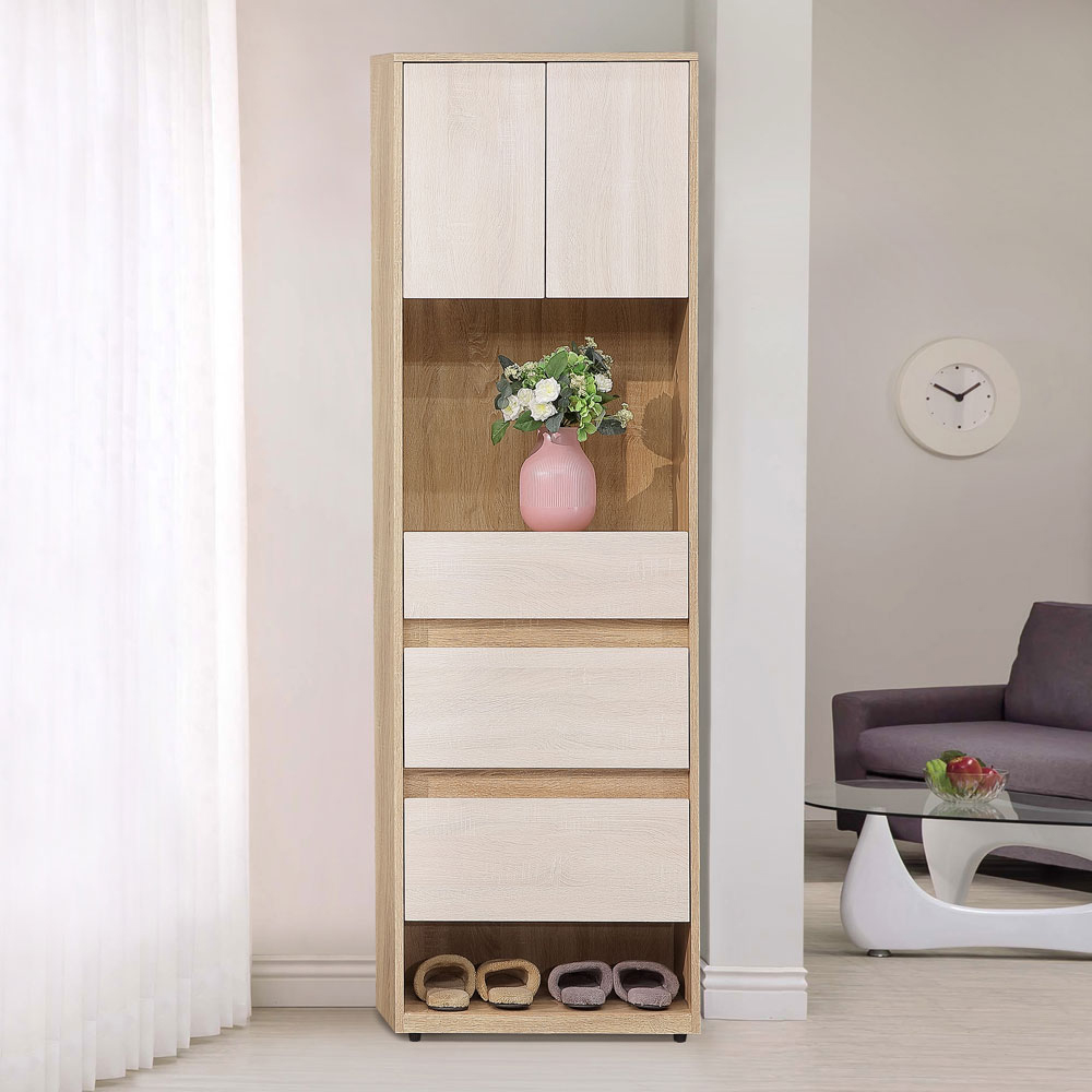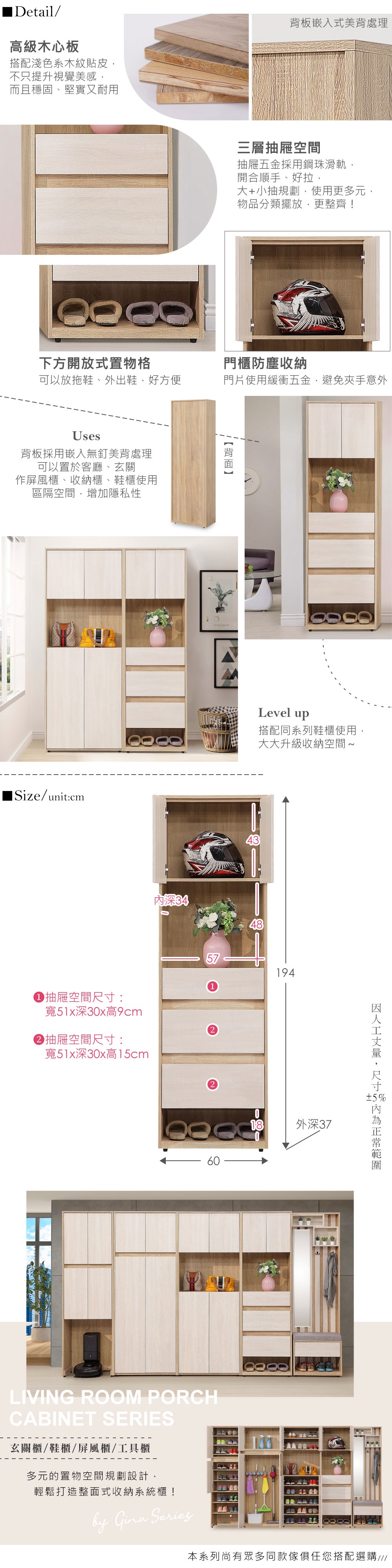 ◆高級木心板材質,堅實耐用◆三層抽屜收納,分類好整齊◆門櫃+抽屜+開放格的多元設計◆免自行組裝,專人配送到府◆簡約清新風格,放大居家空間◆開放格可擺放植裁,增添綠意◆調整腳墊,輕鬆改善水平◆可當玄關櫃、屏風櫃、置物櫃、收納櫃尺寸:寬 60 x 深 37 x 高 194 公分材質:高級木心板顏色:梧桐+白雪松雙色產地:台灣誤差值:因人工丈量,尺寸±5%內為正常範圍