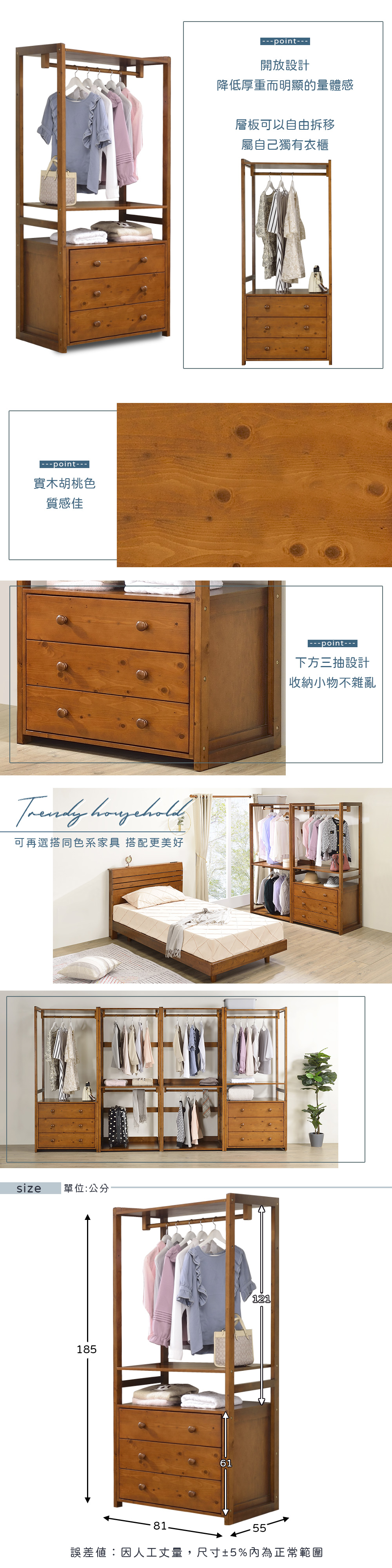◆開放設計,降低壓迫感◆實木材質,品質佳◆下方三抽屜,收納小物◆專人配送,到府組裝◆典雅鄉村風格◆可放臥室、服飾店尺寸:寬 81 x 深 55 x 高 185 公分材質:實木顏色:胡桃色產地:越南誤差值:因人工丈量,尺寸±5%內為正常範圍