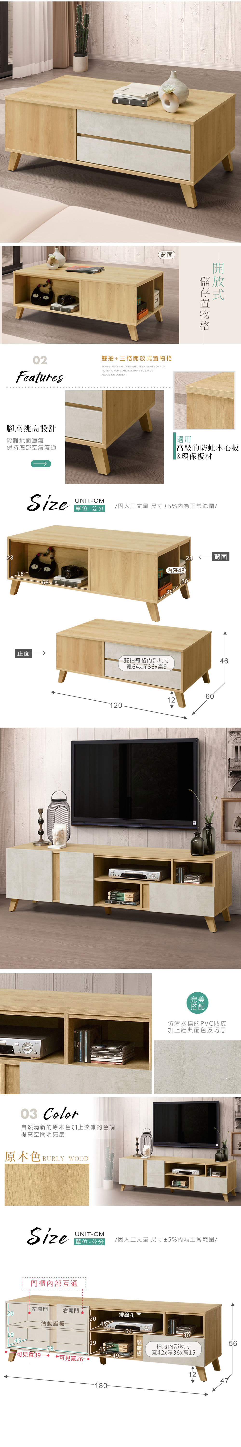 ◆設計師款仿清水模造型◆附排線孔,可輕鬆整線◆挑高腳座隔離地面濕氣◆免組裝,專人宅配到府◆清水模風格+原木色調◆客廳收納的好幫手◆電視櫃,一抽屜+二層開放置物◆茶几二抽屜+三開放格設計整組配件:4尺茶几+6尺電視櫃電視櫃尺寸:寬 180 x 深 47 x 高 56 公分茶几尺寸:寬 120 x 深 60 x 高 46 公分材質:高級木心板、環保防潮板顏色:原木色產地:台灣誤差值: 因人工丈量,尺寸±5%內為正常範圍