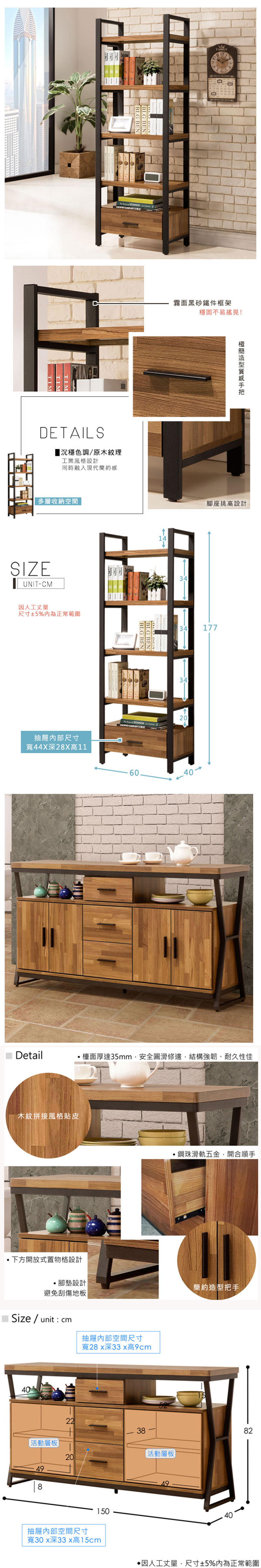 ◆嚴選高級木心板材質◆工業風霧面黑砂鐵架◆免組裝專人配送到府◆工業風格+柚木色調◆廚房、碗盤收納好置物◆高櫃,五層開放格+一抽屜收納◆餐櫃,三層開放格+一抽屜收納餐櫃尺寸:寬 150 x 深 40 x 高 82 公分置物架尺寸:寬 60 x 深 40 x 高 177 cm材質:高級木心板、高碳鋼管顏色:原木色產地:台灣誤差值:因人工丈量,尺寸±5%內為正常範圍