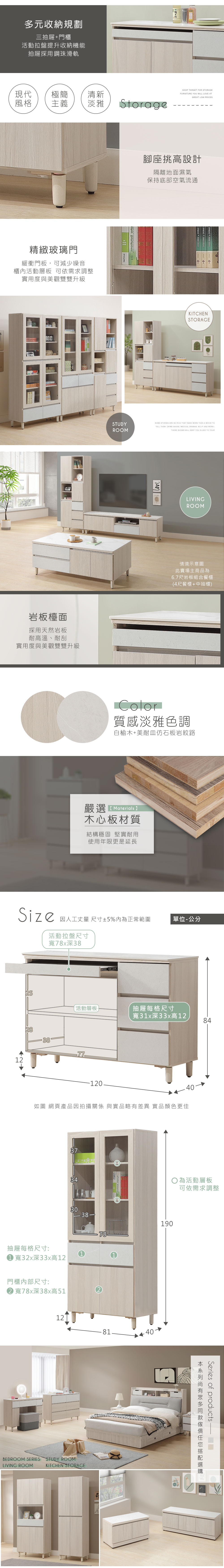 ◆實用多元收納餐廚組合◆活動拉盤提升收納機能◆精緻玻璃門質感再升級◆挑高腳,隔離地面濕氣◆岩板檯面,耐高溫耐刮◆抽屜採用鋼珠滑軌設計◆緩衝門板,可減少噪音◆質感美耐皿仿石岩紋路◆美背處理,正反都美麗◆極簡主義,現代簡約風◆白榆木,清新淡雅色調◆免組裝,專人配送到府整組配件:中抽櫃+4尺岩板餐櫃中抽櫃尺寸:寬 81 x 深 40 x 高 190 公分餐櫃尺寸:寬 120 x 深 40 x 高 84 公分材質:高級木心板、美耐皿、岩板顏色:白榆木雙色產地:台灣誤差值:因人工丈量,尺寸±5%內為正常範圍
