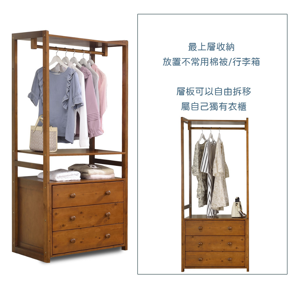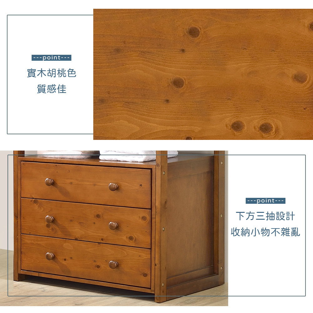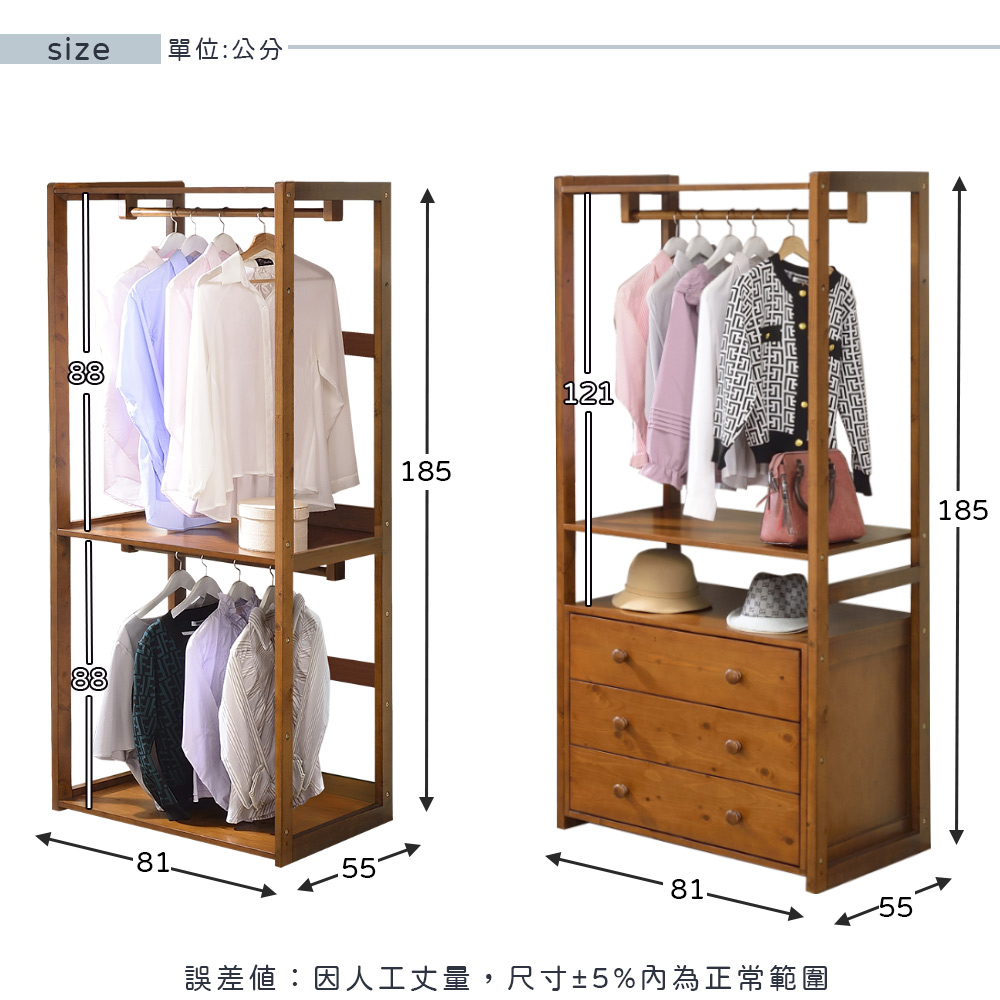 ◆開放設計,降低壓迫感◆實木材質,品質佳◆三抽屜設計,收納小物◆專人配送,到府組裝◆典雅鄉村風格◆可放臥室、服飾店整體配件:三抽櫃 x 1 + 雙吊櫃 x 1尺寸:寬 162 x 深 55 x 高 185 公分材質:實木顏色:胡桃色產地:越南誤差值:因人工丈量,尺寸±5%內為正常範圍