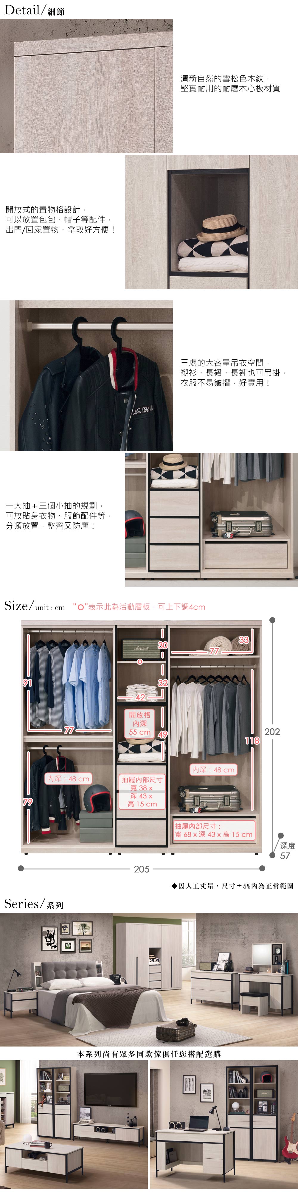 ◆清新自然的雪松色木紋◆大容量的三吊衣空間◆四抽屜+開放格收納設計◆免組裝專人配送到府◆輕工業、北歐自然+金屬風格◆更衣室、臥室置物巧妙的提升◆三吊桿+四抽屜收納尺寸:寬 205 x 深 57 x 高 202 公分材質:高級木心板顏色:白雪松產地:台灣誤差值:因人工丈量,尺寸±5%內為正常範圍