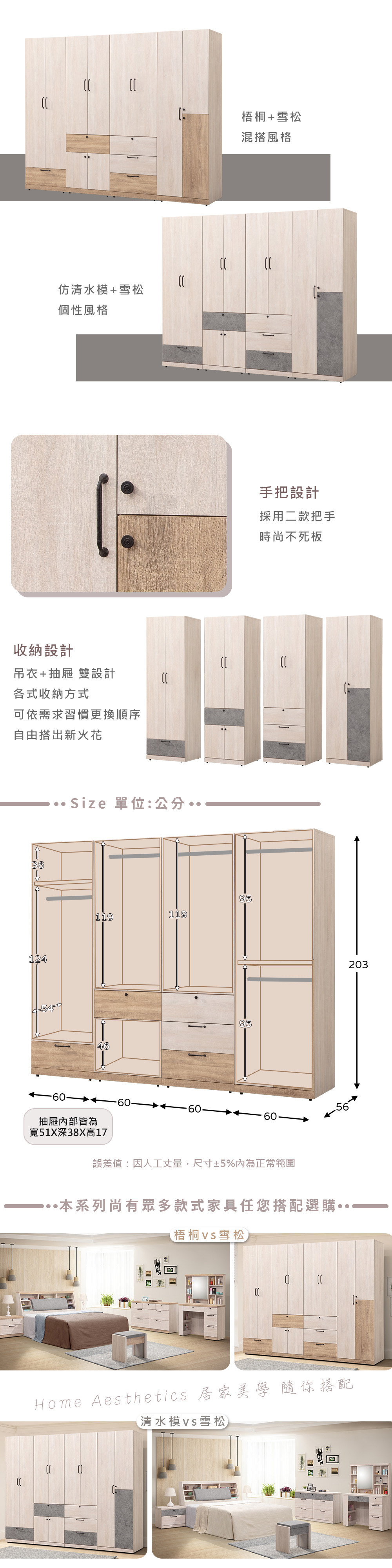 ◆四款樣式順序自由搭◆吊衣+抽屜 雙設計◆門片緩衝後鈕,不怕夾傷手◆免自行組裝,專人配送到府尺寸:寬 240 x 深 56 x 高 203 公分材質:高級木心板顏色:清水模拼色、梧桐拼色產地:台灣誤差值:因人工丈量,尺寸±5%內為正常範圍