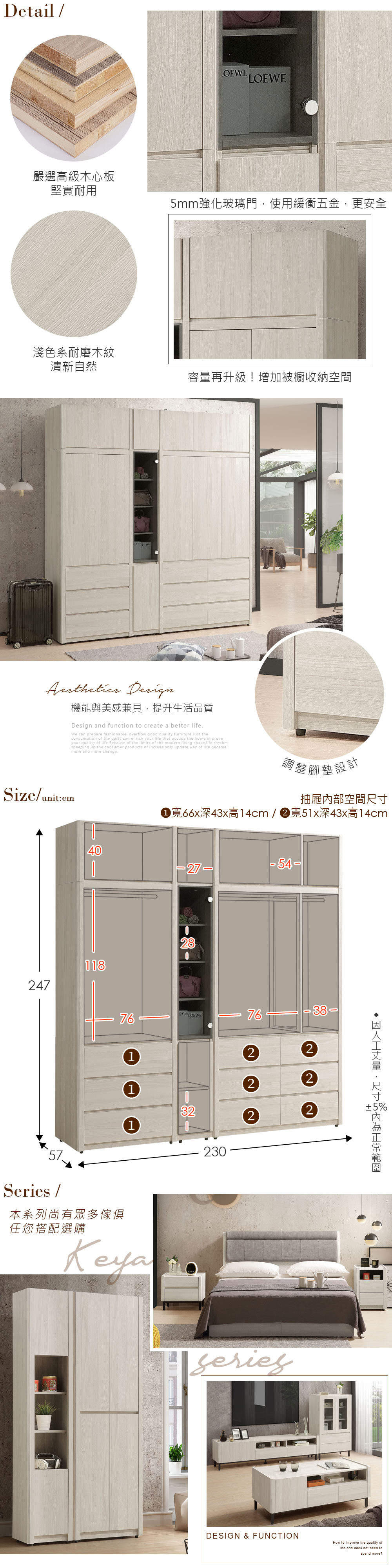 ◆木心板材質,堅實、穩固、耐用◆清新淺色系,質感木紋路視覺◆5mm強化灰色玻璃,美型、微透視感◆吊衣空間+抽屜+被櫥的大容量收納組合◆門片使用緩衝五金,開合安全、避免夾手◆免組裝,專人配送到府尺寸:寬 230 x 深 57 x 高 247 公分材質:高級木心板、5mm強化玻璃顏色:白榆木色產地:台灣誤差值:因人工丈量,尺寸±5%內為正常範圍