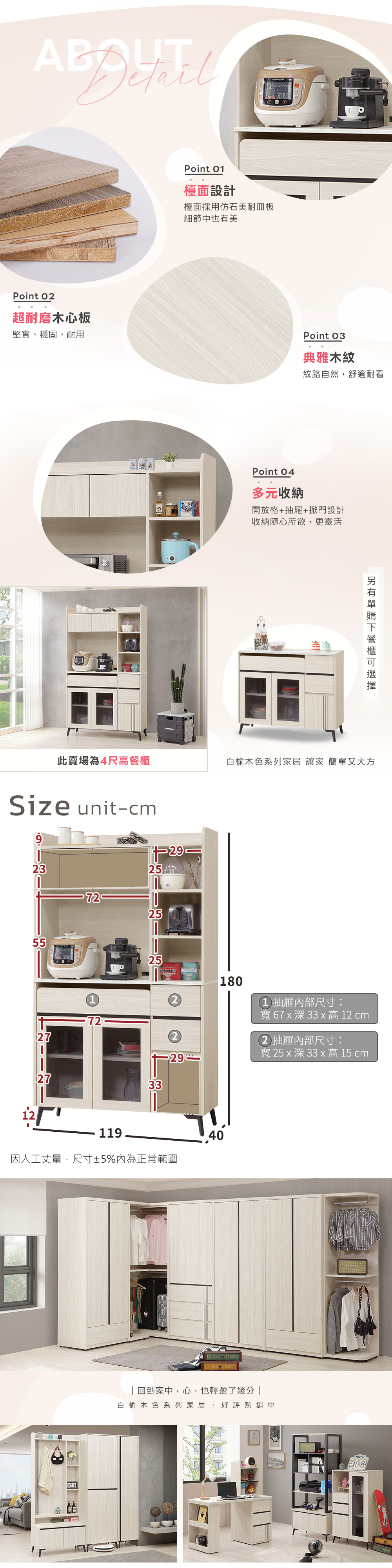 ◆白榆現代、英倫風格◆檯面採用仿石美耐皿板設計◆採半透明灰色玻璃◆附有插座,方便電器使用◆免自行組裝,專人配送到府尺寸:寬 119 x 深 40 x 高 180 公分材質:高級木心板+仿石美耐皿板顏色:白榆木色產地:台灣誤差值: 因人工丈量,尺寸±5%內為正常範圍