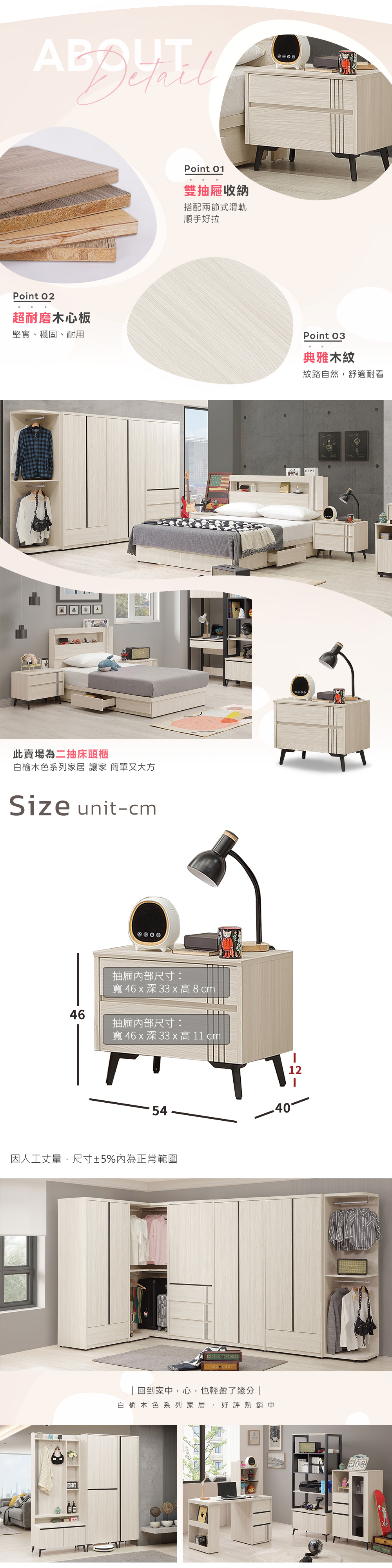 ◆白榆現代、英倫風格◆雙抽屜收納空間◆兩節式滑軌順手好拉◆免自行組裝,專人配送到府尺寸:寬 54 x 深 40 x 高 46 公分材質:高級木心板顏色:白榆木色產地:台灣誤差值: 因人工丈量,尺寸±5%內為正常範圍