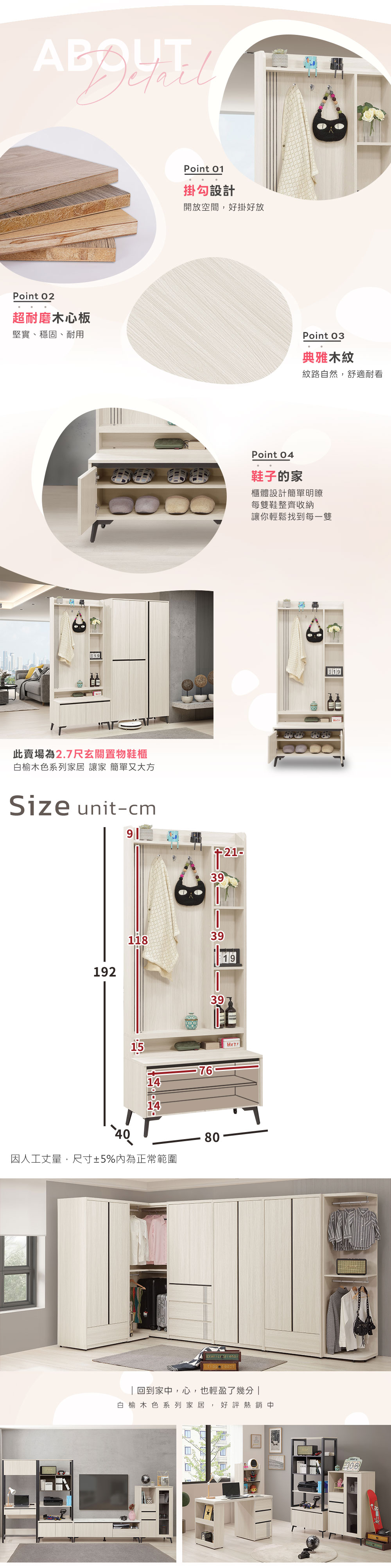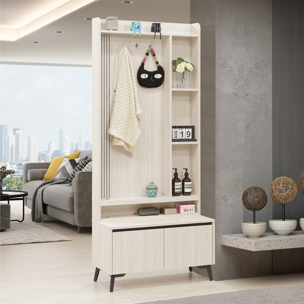◆白榆現代、英倫風格◆附掛勾,可掛包包、外套◆玄關空間,美觀大方◆免自行組裝,專人配送到府尺寸:寬 80 x 深 40 x 高 192 公分材質:高級木心板顏色:白榆木色產地:台灣誤差值: 因人工丈量,尺寸±5%內為正常範圍