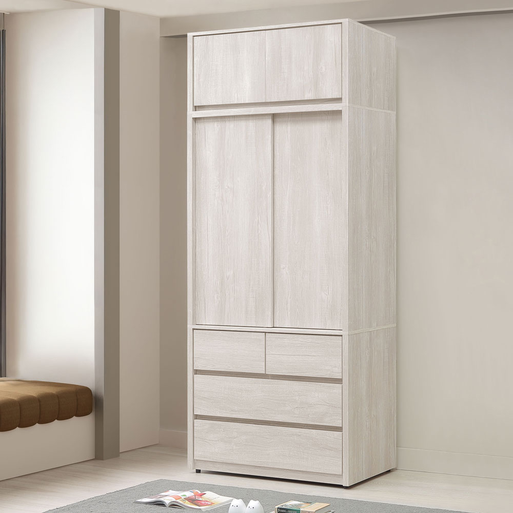 ◆木心板材質,堅實、穩固、耐用◆清新淺色系,質感木紋路視覺◆推門式設計,節約空間◆雙吊衣桿,方便吊掛衣物◆下方抽屜空間,能分類衣物、收納防塵◆上方被櫃收納空間,容量升級◆免組裝,由專人宅配到府尺寸:寬 105 x 深 60 x 高 250 公分材質:高級木心板顏色:白榆木色產地:台灣誤差值:因人工丈量,尺寸±5%內為正常範圍