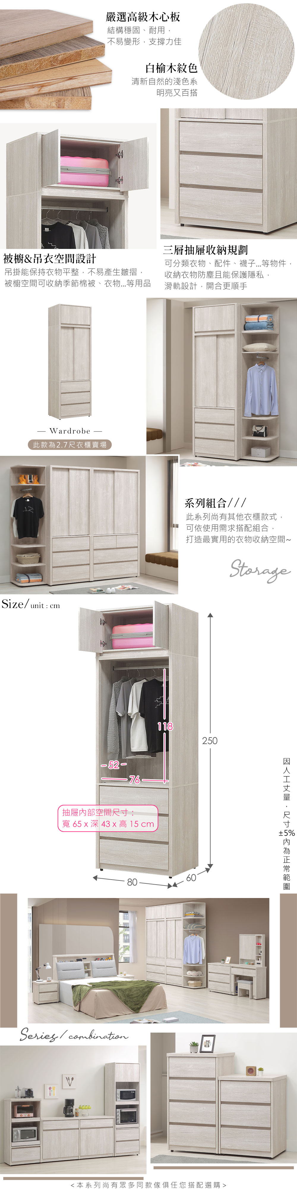 ◆木心板材質,堅實、穩固、耐用◆清新淺色系,質感木紋路視覺◆推門式設計,節約空間◆單吊衣桿空間,方便吊掛衣物◆下方抽屜空間,能分類衣物、收納防塵◆上方被櫃收納空間,容量升級◆免組裝,由專人宅配到府尺寸:寬 80 x 深 60 x 高 250 公分材質:高級木心板顏色:白榆木色產地:台灣誤差值:因人工丈量,尺寸±5%內為正常範圍