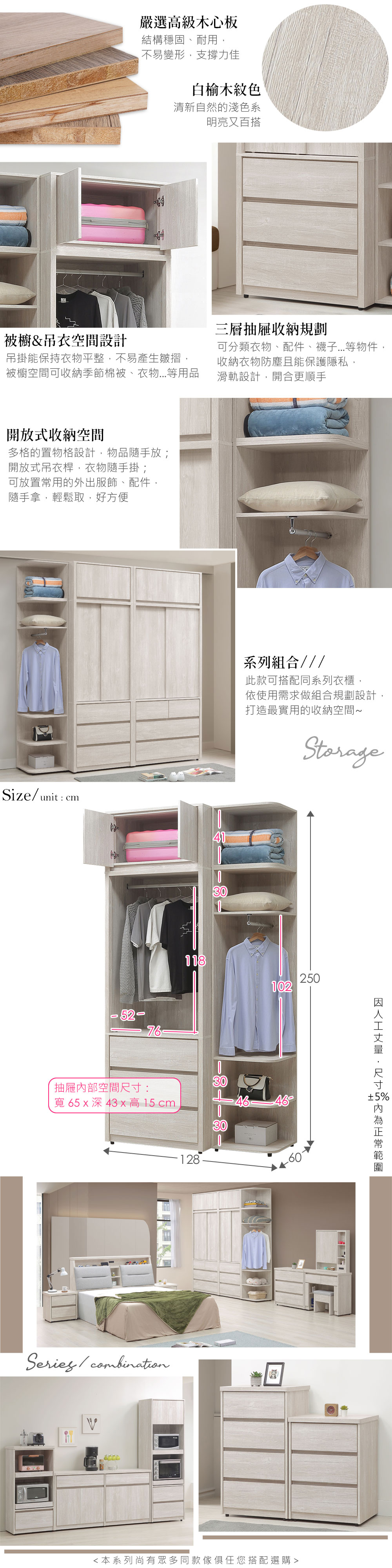◆木心板材質,堅實、穩固、耐用◆清新淺色系,質感木紋路視覺◆推門式設計,節約空間◆單吊衣桿空間,方便吊掛衣物◆下方抽屜空間,能分類衣物、收納防塵◆側邊開放式轉角櫃,方便隨手掛、隨手取◆上方被櫃收納空間,容量升級◆免組裝,由專人宅配到府尺寸:寬 128 x 深 60 x 高 250 公分材質:高級木心板顏色:白榆木色產地:台灣誤差值:因人工丈量,尺寸±5%內為正常範圍