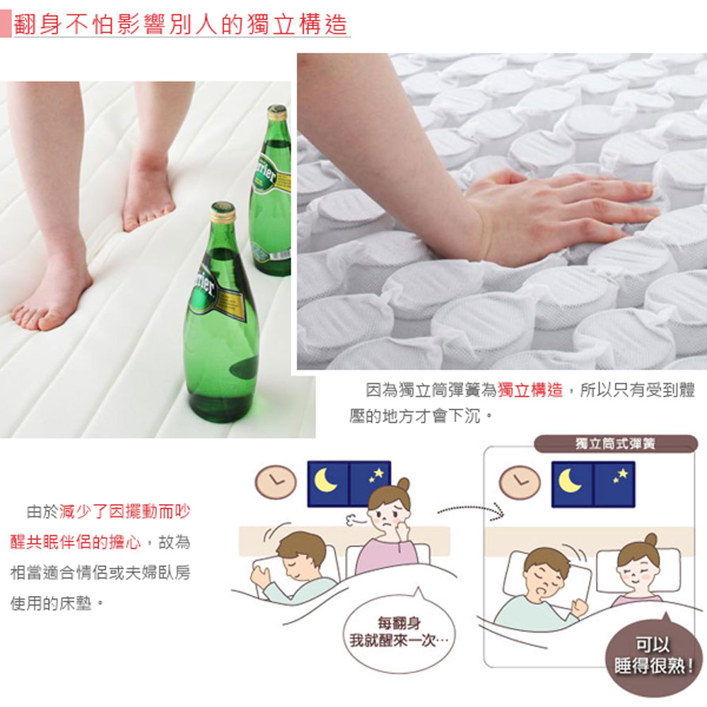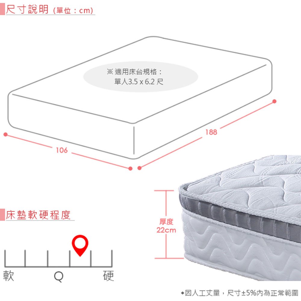 ◆採用2.4mm高碳鋼獨立筒◆獨立筒設計,抗干擾◆100%台灣製造的好品質◆立體車花舒柔布◆床墊軟硬度:硬Q◆厚度22公分尺寸:寬 106 x 長 188 x 厚 22 公分材質說明: 第一層-立體車花舒柔布 第二層-高支撐樹籽棉 第三層-高密度泡棉 第四層-高張力纖維布 第五層-高支撐力聚合棉 第六層-防潮不織布 第七層-獨立筒袋裝編織 第八層-中鋼高碳鋼2.4mm獨立筒 第九層-防鬆動無毒樹脂 第十層-防潮防鏽不織布 第十一層-防潮不織布 第十二層-高支撐力聚合棉 第十三層-立體車花緹花布產地:台灣誤差值:因人工丈量,尺寸±5%內為正常範圍
