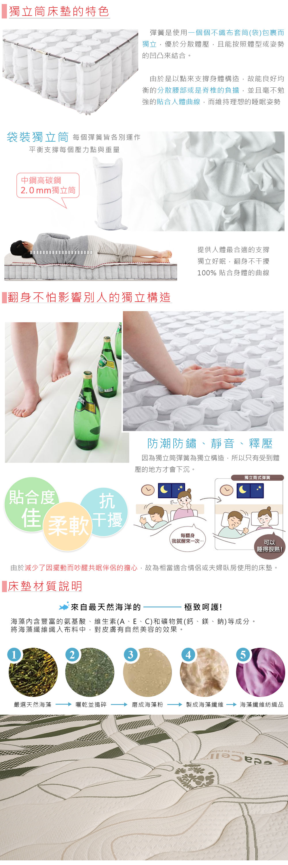◆海藻纖維表布◆藻類特性,柔軟絲滑質感◆使用2.0mm中鋼高碳鋼獨立筒◆互不干擾的獨立筒結構◆品質保證100%台灣製造◆專人配送,到府安裝整組配件:床墊 x1(不含床台)尺寸:寬 182 x 長 188 x 厚 27 公分材質說明: 第一層-海藻纖維SeaCell布 第二層-高支撐力樹籽棉 第三層-高密度泡棉 第四層-高支撐力聚合棉 第五層-高張力纖維布 第六層-高密度聚合棉 第七層-防鬆動無毒樹脂 第八層-中鋼高碳鋼2.0mm獨立筒 第九層-防鬆動無毒樹脂 第十層-獨立筒袋裝編織 第十一層-高張力纖維布 第十二層-防潮防鏽不織布 第十三層-防潮不織布 第十四層-高支撐力杜邦棉 第十五層-止滑精梳棉平織布產地:台灣誤差值:因人工丈量,尺寸±5%內為正常範圍