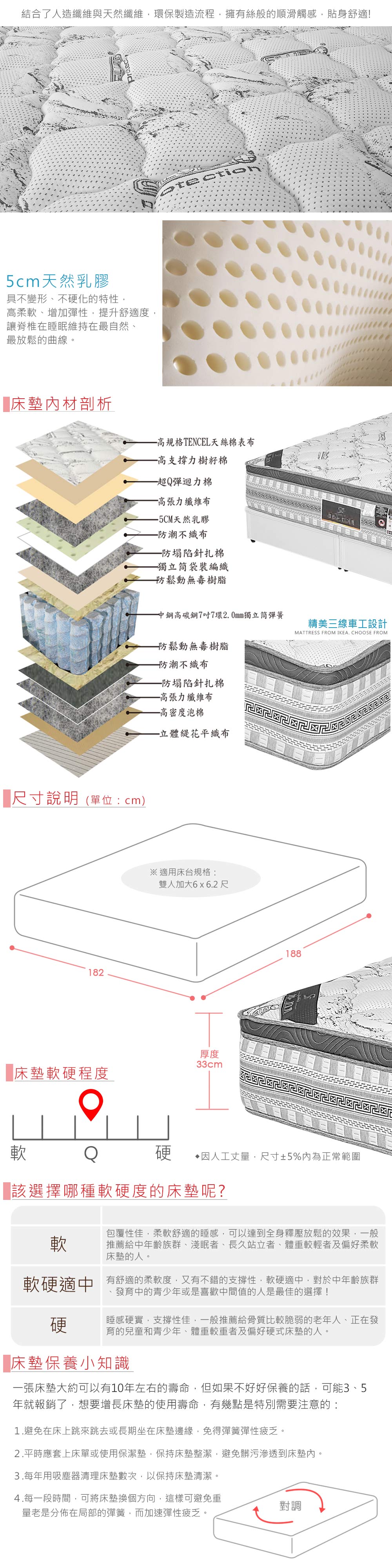 ◆5cm高柔軟天然乳膠◆天絲棉質感舒柔表布◆專人配送,到府安裝◆TENCEL天絲棉表布◆2.0mm中鋼高碳鋼獨立筒◆床墊軟硬度:偏Q◆厚度33公分整組配件:床墊 x1(不含床台)尺寸:寬 182 x 長 188 x 厚 33 公分材質說明:第一層-高規格TENCEL天絲棉表布第二層-高支撐樹籽棉第三層-超Q彈迴力棉第四層-高張力纖維布第五層-5cm天然乳膠第六層-防潮不織布第七層-防塌陷針扎棉第八層-獨立筒袋裝編織第九層-防鬆動無毒樹脂第十層-中鋼高碳鋼7吋7環2.0mm獨立筒彈簧第十一層-防鬆動無毒樹脂第十二層-防潮不織布第十三層-防塌陷針扎棉第十四層-高張力纖維布第十五層-高密度泡棉第十六層-立體緹花平織布產地:台灣誤差值:因人工丈量,尺寸±5%內為正常範圍