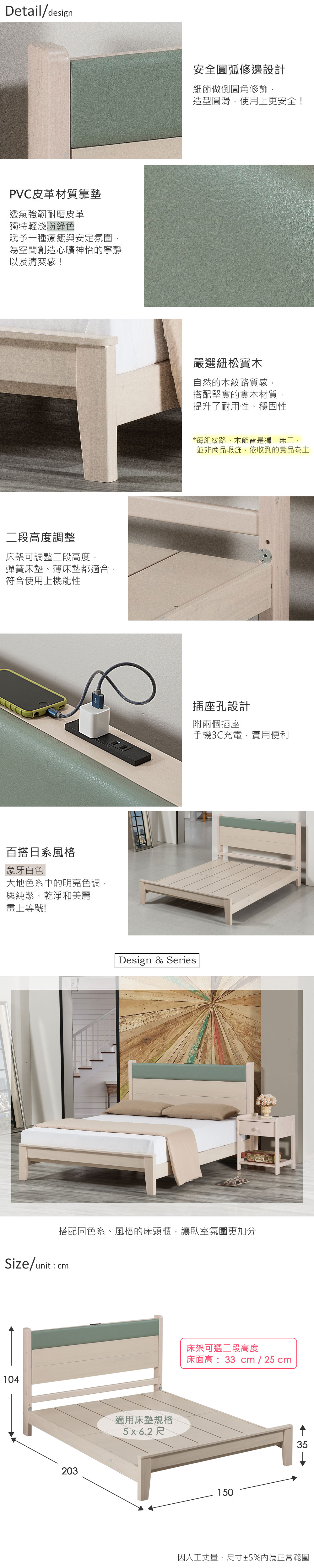 ◆插座孔設計,實用便利◆床架可調整,二段高度◆透氣強韌耐磨皮革靠墊◆專人配送到府組裝整組配件:5尺床底 x1 (不含床墊)尺寸:長 203 x 寬 150 x 高 104 公分適用床墊規格:5 x 6.2 尺材質:松木、實木夾板、PVC皮革顏色:象牙白產地:台灣誤差值:因人工丈量,尺寸±5%內為正常範圍