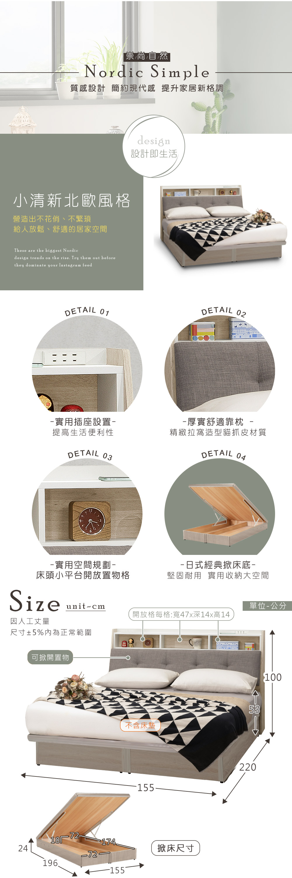 ◆掀床組實用收納大空間◆床頭平台便利插座設置◆嚴選木心板,穩固耐用◆免組裝,專人配送到府◆淡雅色調,清新北歐風格◆床頭箱+掀床組合整組配件:5尺床頭箱 + 5尺掀床(不含床墊)尺寸:長 220 x 寬 155 x 高 100 公分材質:高級木心板、系統板顏色:北歐白產地:台灣適用床墊規格:5 x 6.2尺誤差值:因人工丈量,尺寸±5%內為正常範圍