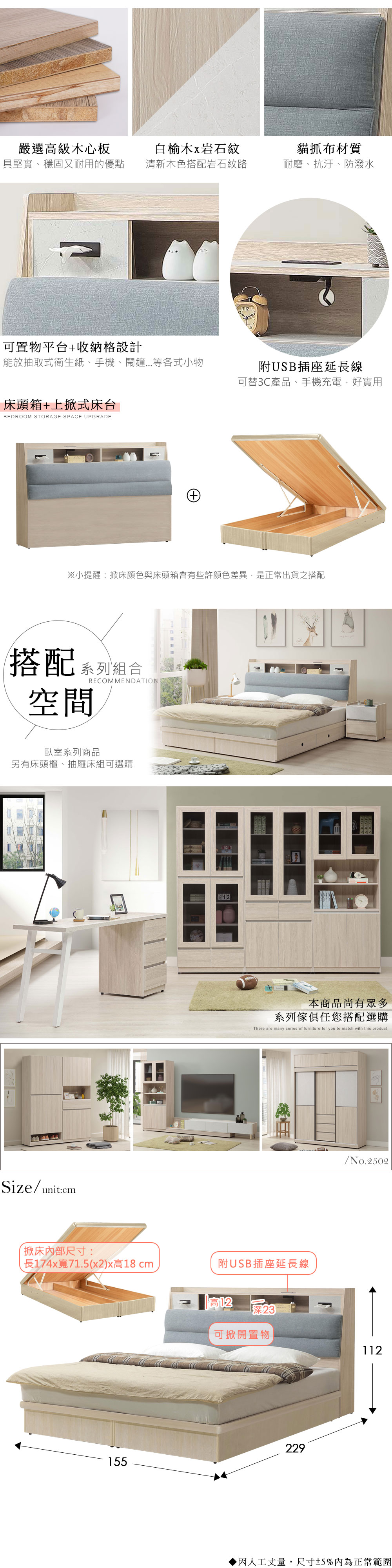 ◆嚴選高級木心板◆舒適、耐磨的貓抓布材質靠墊◆附USB、面紙收納格,實用多功能◆掀床床底設計,大空間、置物方便◆清新的淺色系搭配自然木紋肌理◆免自行組裝,專人配送到府整組商品:床頭箱 x 1 + 掀床 x 1尺寸:寬 155 x 深 229 x 高 112 公分適用床組規格:5 x 6.2 尺材質:高級木心板、貓抓布靠墊、美耐皿顏色:白榆木雙色產地:台灣誤差值:因人工丈量,尺寸±5%內為正常範圍