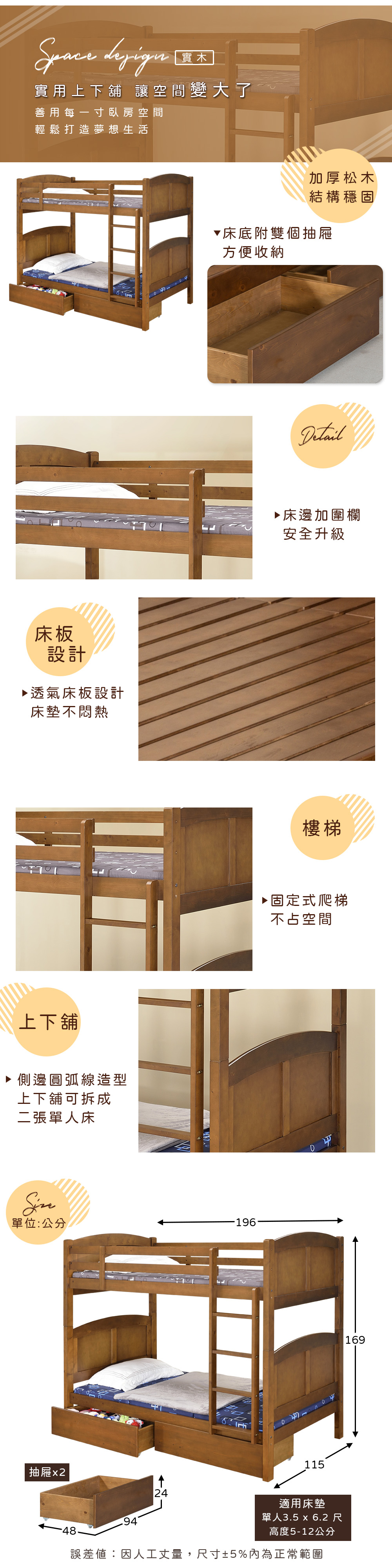 ◆透氣床板設計,床墊不悶熱◆下方附抽屜,可收納物品◆可拆成二張單人床◆免組裝,專人配送到府◆直立式樓梯設計整體配件:3.5尺雙層床x1+床下抽屜x2 (不含床墊)尺寸:長 196 x 寬 115 x 高 169 公分適用床墊:3.5 x 6.2 尺材質:松木+實木夾板顏色:胡桃色產地:越南誤差值:因人工丈量,尺寸±5%內為正常範圍