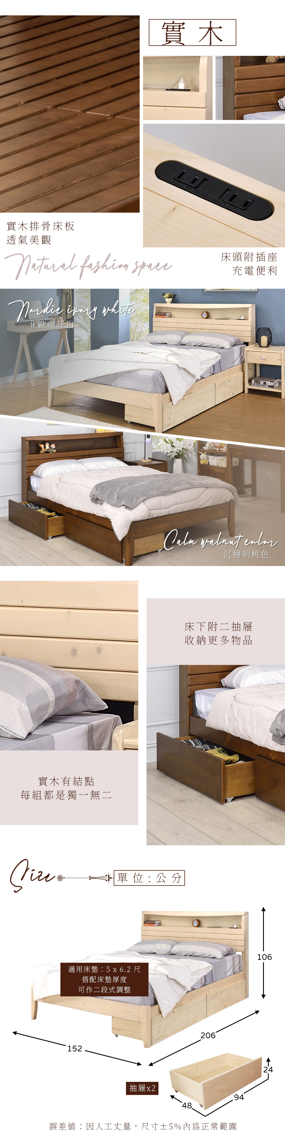 ◆透氣床板設計,透氣不悶熱◆床下附二抽屜,方便收納◆床頭附插座,充電便利◆免組裝,專人配送到府◆可作二段式調整高度整體配件:5尺床架 x 1+床下抽屜x2 (不含床墊)尺寸:寬 152 x 深 206 x 高 106 公分適用床墊:5 x 6.2 尺材質:實木框、實木夾板顏色:胡桃色/象牙白產地:越南誤差值:因人工丈量,尺寸±5%內為正常範圍