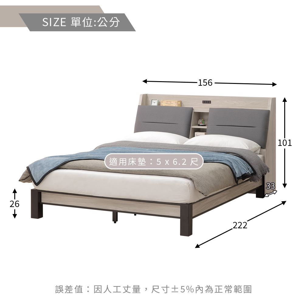 ◆同款二款色調,搭配居家風格◆雪杉簡約、現代風格◆工業積層木色調風格◆可掀式床頭箱輕鬆收納◆安心配送,由專人到府組裝◆實用便利插座孔設計◆床頭箱+床架組合整組配件:床頭箱 x 1 + 床架 x 1尺寸:寬 156 x 深 222 x 高 101 公分適用床墊:5 x 6.2 尺材質:高級木心板顏色:雪杉色產地:台灣誤差值:因人工丈量,尺寸±5%內為正常範圍