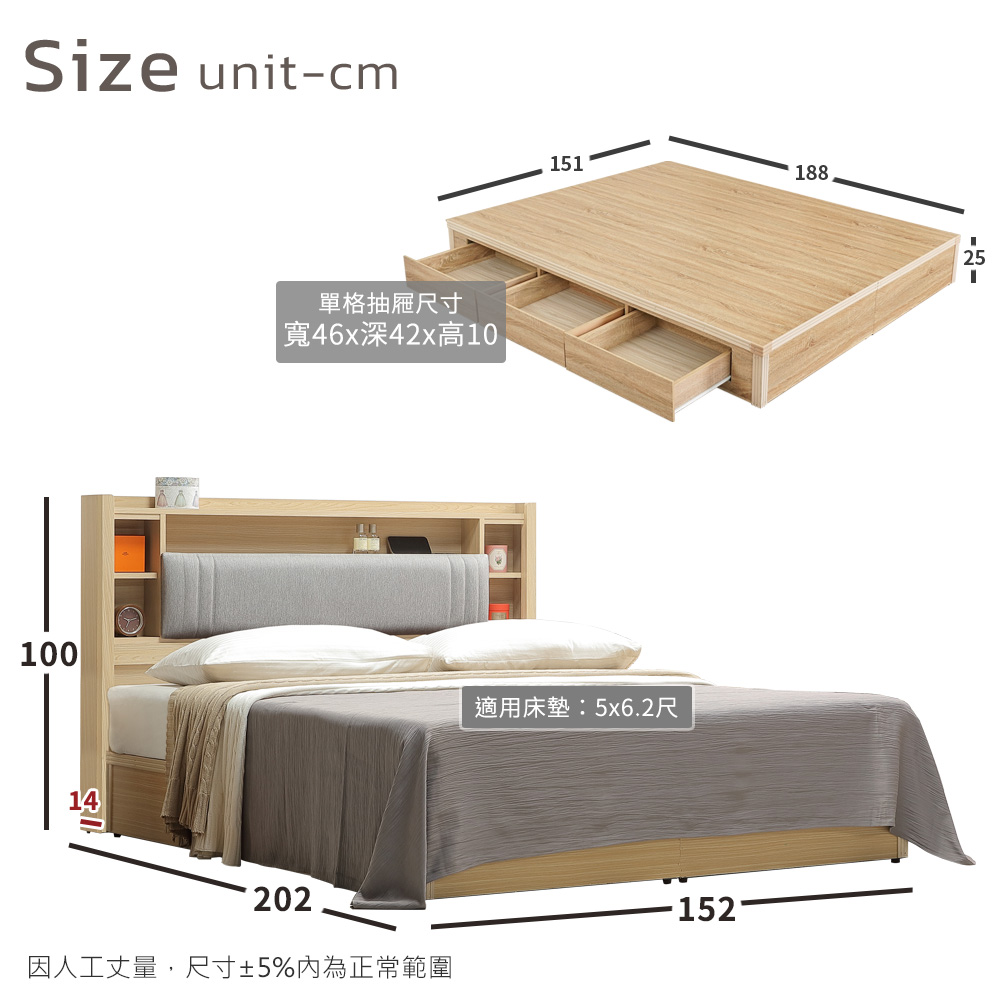 ◆木心板材質,堅實、穩固、耐用◆典雅木紋,演繹大器沉穩◆貓抓皮床頭,大幅增加靠感舒適度◆床頭安全插座,充電超方便◆抽屜床台,六抽屜分類收納更便利◆免組裝,專人配送到府整組商品:床頭片 x 1 + 抽屜床台x 1(不含床墊)尺寸:寬 152 x 深 202 x 高 100 公分適用床墊規格:5 x 6.2 尺材質:高級木心板+三分夾板顏色:杉木色產地:台灣誤差值:因人工丈量,尺寸±5%內為正常範圍