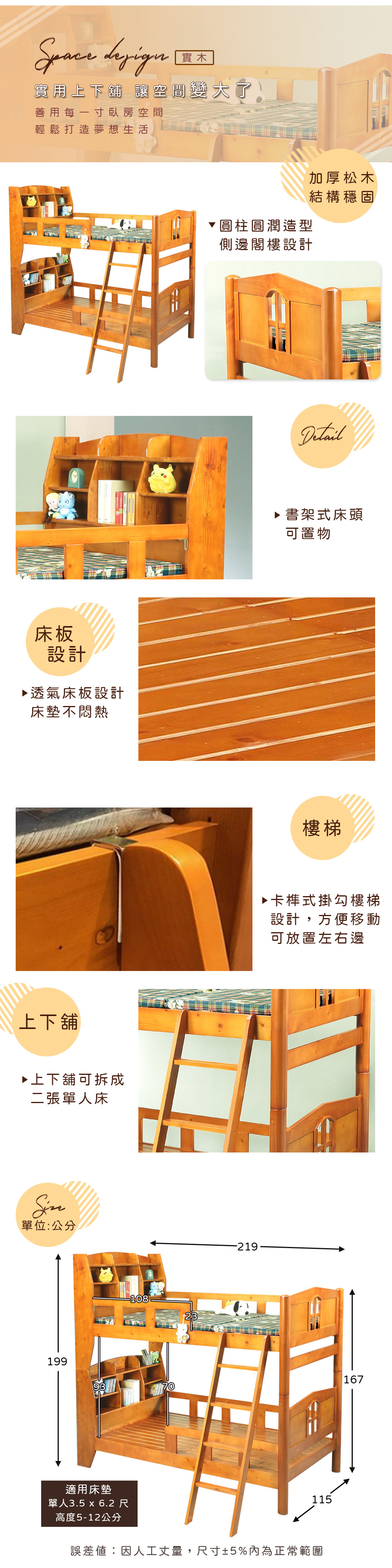 ◆透氣床板設計,床墊不悶熱◆床頭書架收納設計◆可拆成二張單人床◆免組裝,專人配送到府◆掛勾式斜樓梯設計整體配件:3.5尺雙層床x1(不含床墊)尺寸:長 219 x 寬 115x 高 199 公分適用床墊:3.5 x 6.2 尺材質:松木+實木夾板顏色:柚木色產地:越南誤差值:因人工丈量,尺寸±5%內為正常範圍