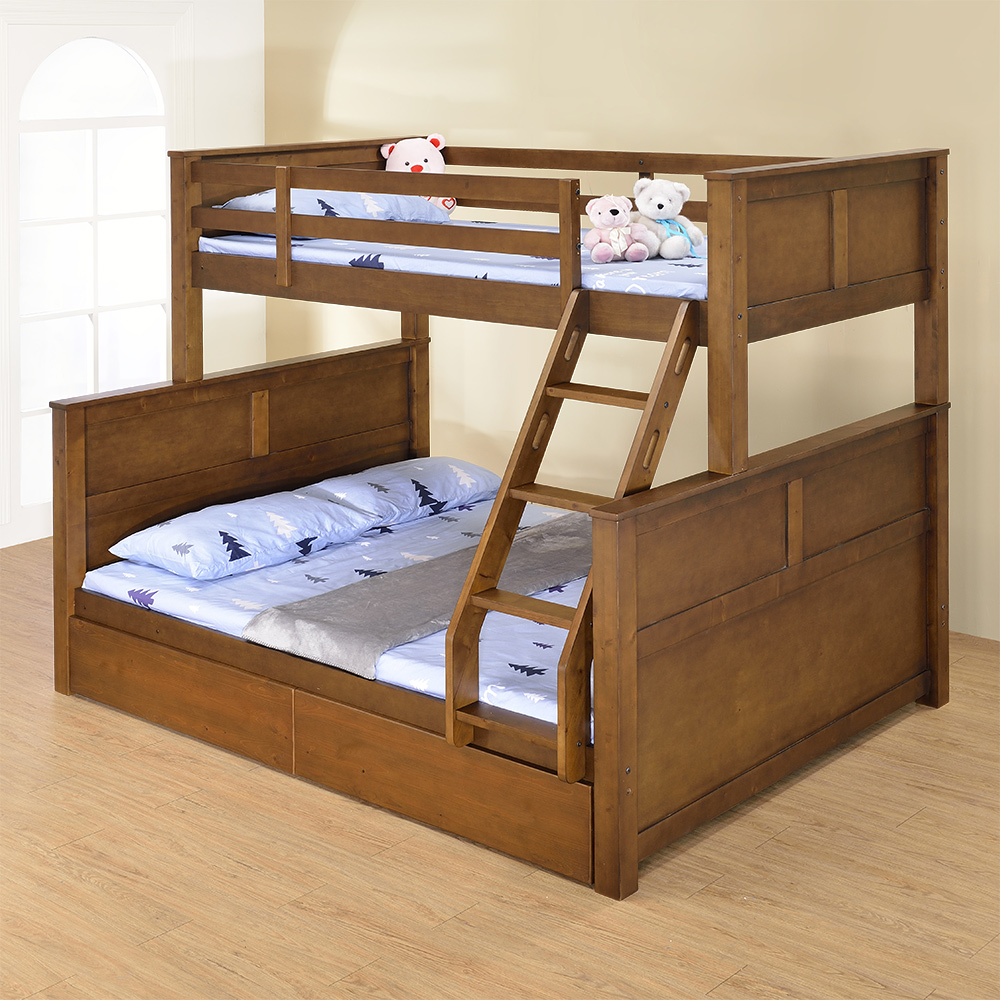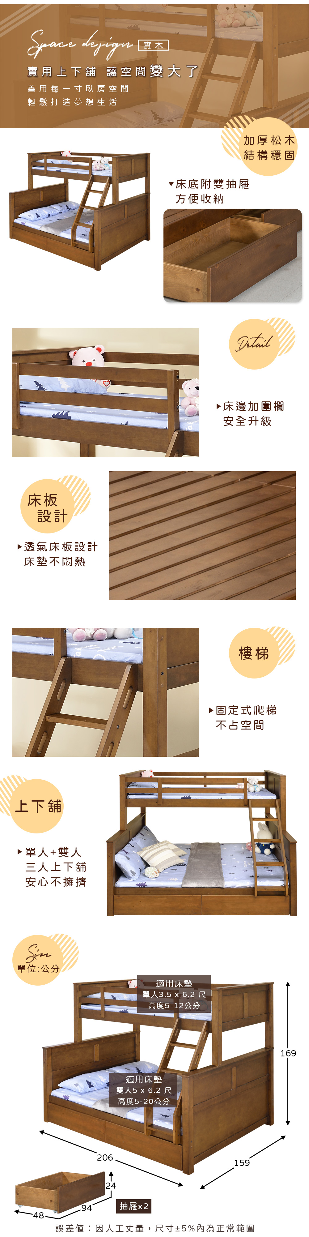 ◆透氣床板設計,床墊不悶熱◆單人+雙人,使用空間更多◆下方附抽屜,可收納物品◆免組裝,專人配送到府◆斜樓梯設計整體配件:雙層床x1+床下抽屜x2 (不含床墊)尺寸:長 206 x 寬 159 x 高 169 公分適用床墊:上方適用3.5 x 6.2 尺,下方適用 5 x 6.2尺材質:松木+實木夾板顏色:胡桃色產地:越南誤差值:因人工丈量,尺寸±5%內為正常範圍