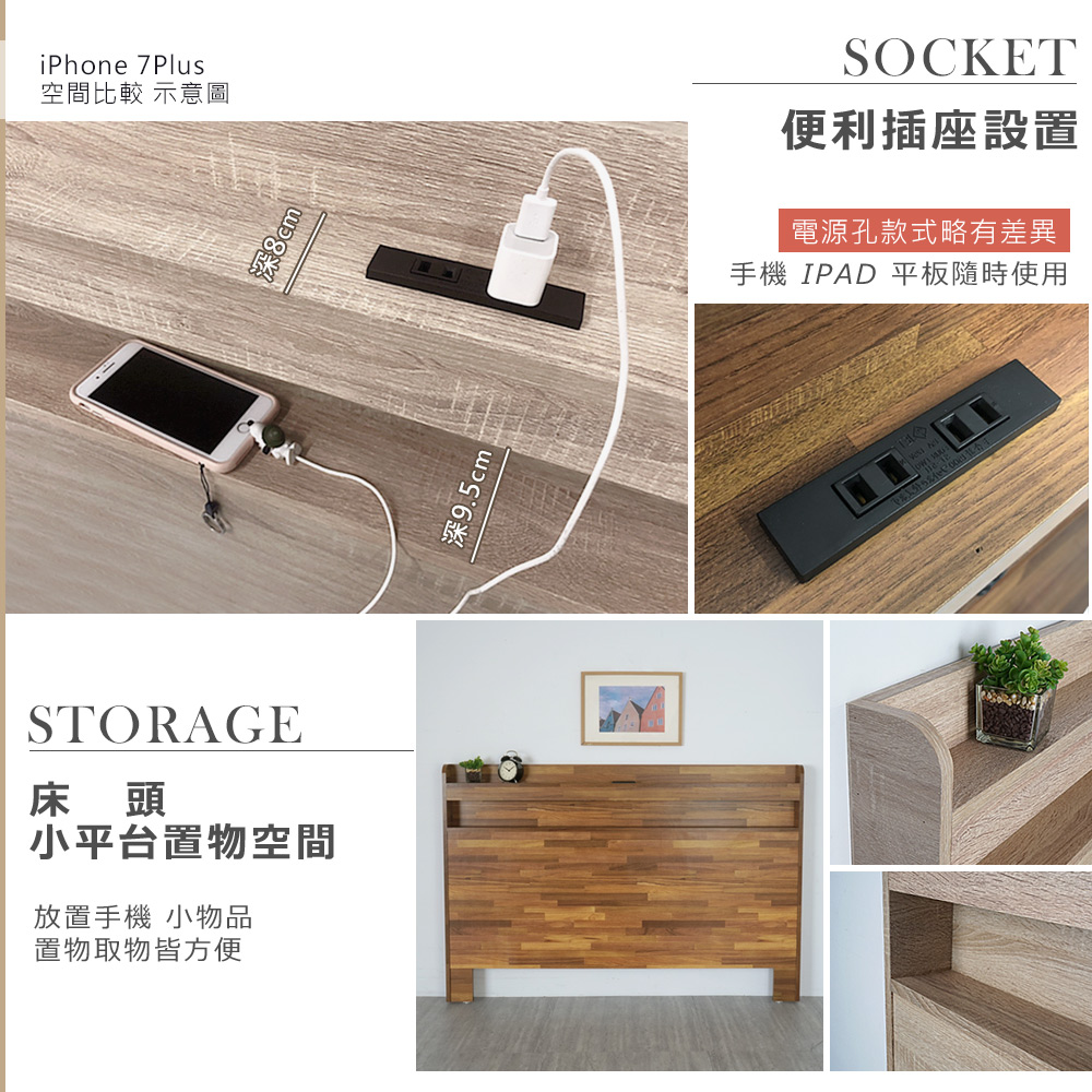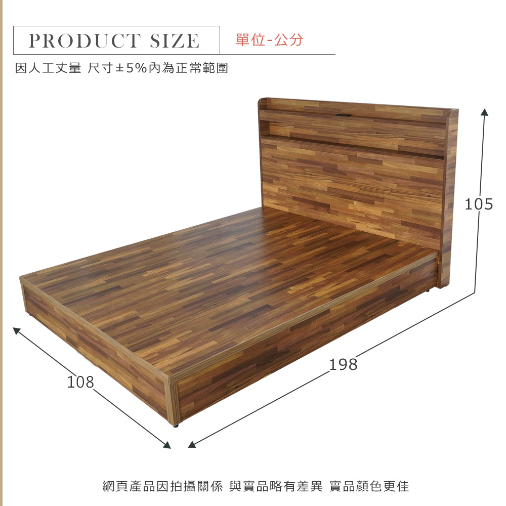 ◆實用便利插座孔設計◆極簡日式森林系風格◆床頭小平台置物空間◆免組裝專人配送到府◆床頭片+床台整組配件:3.5尺床頭片 + 3.5尺床台(不含床墊)尺寸:長 198 x 寬 108 x 高 105 cm材質:高級木心板+三分夾板顏色:積層木產地:台灣誤差值: 因人工丈量,尺寸±5%內為正常範圍