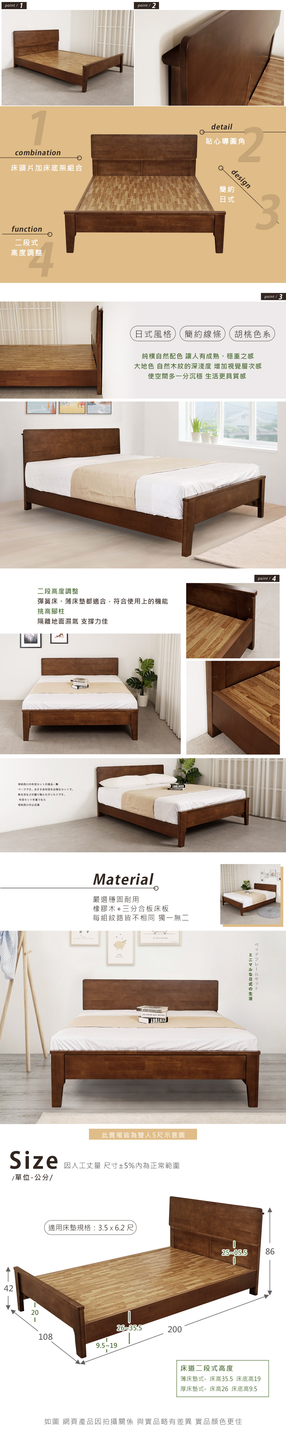 ◆嚴選穩固耐用橡膠木◆自然大地色胡桃色調◆日式風格,清新簡約◆挑高腳柱,支撐力佳◆床架二段式高度調整◆床頭片加床底架組合◆免組裝專人配送到府整組配件:3.5尺床頭片 + 3.5尺床架 (不含床墊)尺寸:長 200 x 寬 108 x 高 86 公分材質:橡膠木+三分合板床板顏色:胡桃色產地:中國適用床墊規格:3.5 x 6.2尺誤差值:因人工丈量,尺寸±5%內為正常範圍