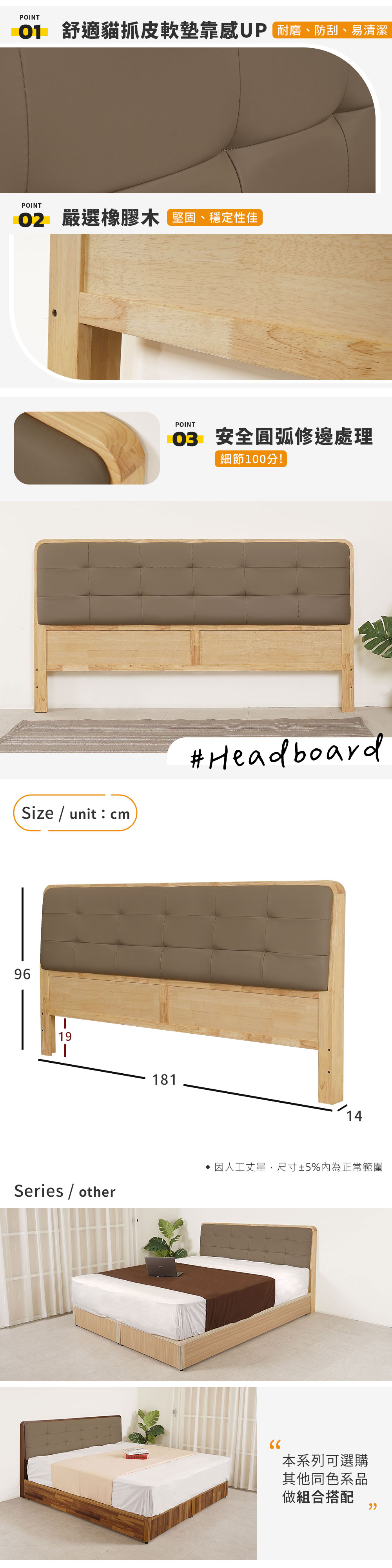 ◆嚴選穩固耐用的橡膠木◆耐磨、防刮貓抓皮靠墊◆日式風格,清新簡約感◆免組裝由專人配送到府整組配件:6尺床頭片尺寸:寬 181 x 厚 14 x 高 96 公分材質:貓抓皮、橡膠木顏色:原木色產地:中國誤差值:因人工丈量,尺寸±5%內為正常範圍