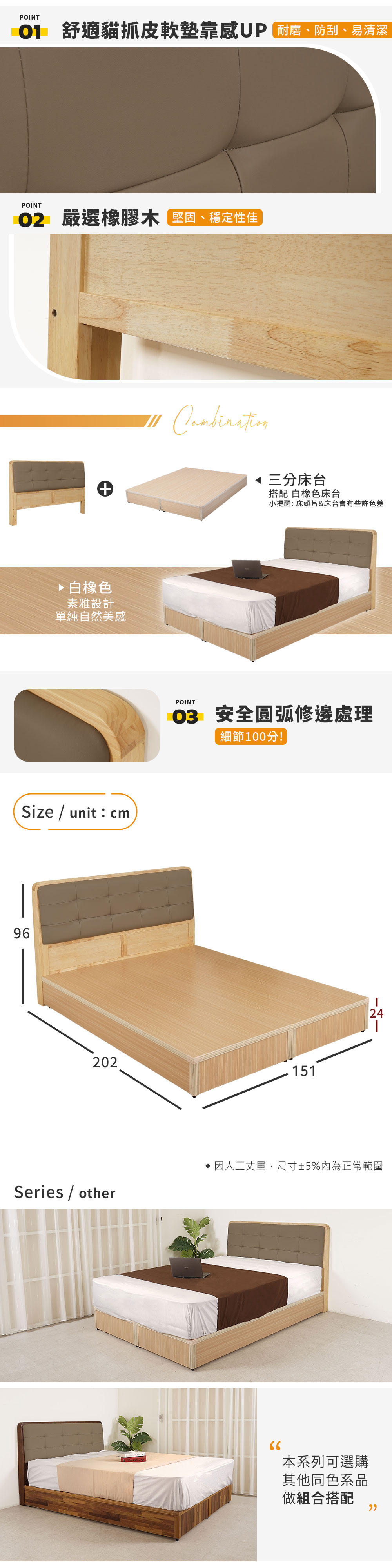 ◆嚴選穩固耐用的橡膠木◆耐磨、防刮貓抓皮靠墊◆日式風格,清新簡約感◆搭配三分床台◆免組裝由專人配送到府整組配件:5尺床頭片x1+5尺床台x1(不含床墊)適用床墊:5 x 6.2 尺尺寸:寬 151 x 深 202 x 高 96 公分材質:貓抓皮、橡膠木、三分夾板顏色:原木色產地:中國/台灣誤差值:因人工丈量,尺寸±5%內為正常範圍
