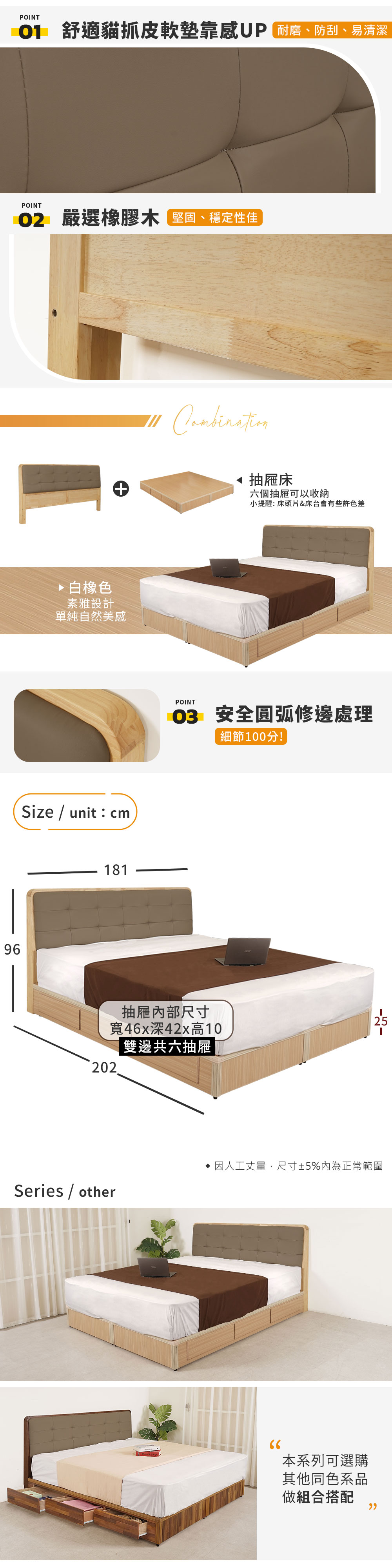 ◆嚴選穩固耐用的橡膠木◆耐磨、防刮貓抓皮靠墊◆日式風格,清新簡約感◆左右邊各三抽屜,共六抽屜◆免組裝由專人配送到府整組配件:6尺床頭片x1+6尺床台x1(不含床墊)適用床墊:6 x 6.2 尺尺寸:寬 181 x 深 202 x 高 96 公分床頭片材質:貓抓皮、橡膠木床台材質:三分夾板顏色:原木色產地:台灣/ 中國誤差值:因人工丈量,尺寸±5%內為正常範圍