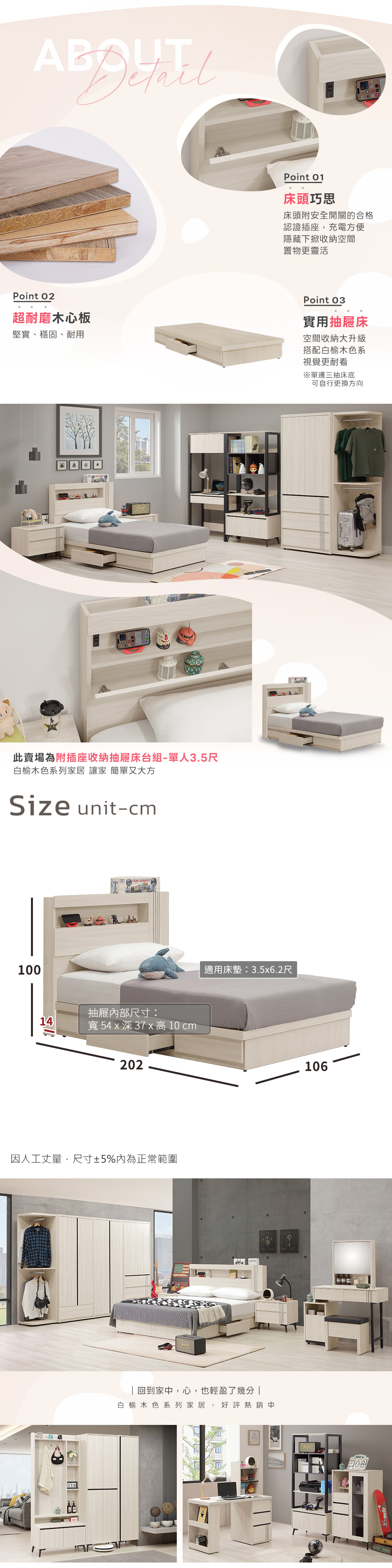 ◆白榆現代、英倫風格◆床頭附有插座,方便充電◆床頭隱藏下掀收納小物◆床頭片+抽屜床台組合◆免自行組裝,專人配送到府整組商品:3.5尺床頭片 x 1 + 3.5床台 x 1尺寸:寬 106 x 深 202 x 高 100 公分適用床組規格:3.5 x 6.2 尺材質:高級木心板顏色:白榆木色產地:台灣誤差值: 因人工丈量,尺寸±5%內為正常範圍
