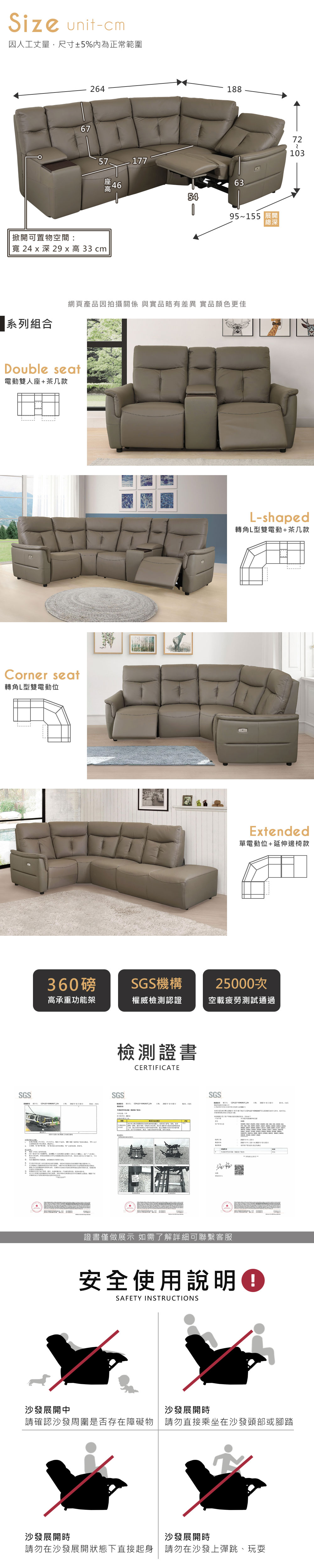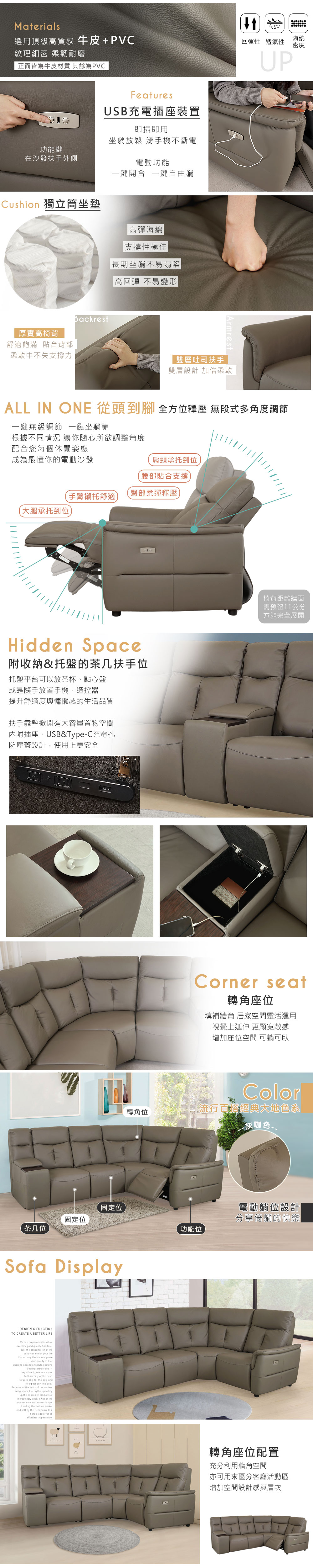 ◆一鍵自由躺,全方位釋壓◆選用頂級高質感牛皮材質◆獨立筒彈簧坐墊,彈性佳◆茶几座內有收納空間&附充電孔◆轉角L型設計,座位空間更寬敞◆便利的USB充電插座裝置◆免組裝,由專人配送到府尺寸:寬 264 x 深 188 x 高 103 公分材質:牛皮+PVC顏色:灰咖色產地:中國誤差值:因人工丈量,尺寸±5%內為正常範圍
