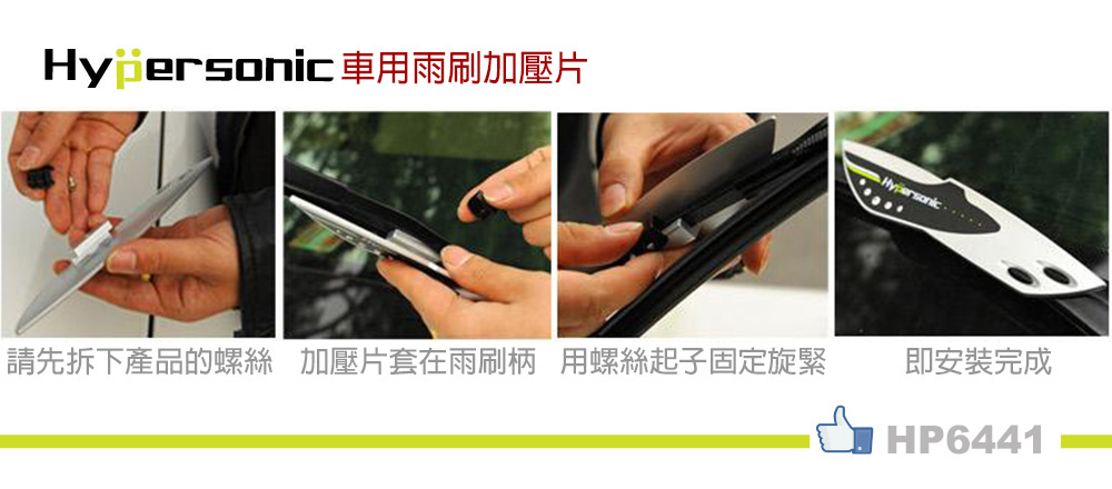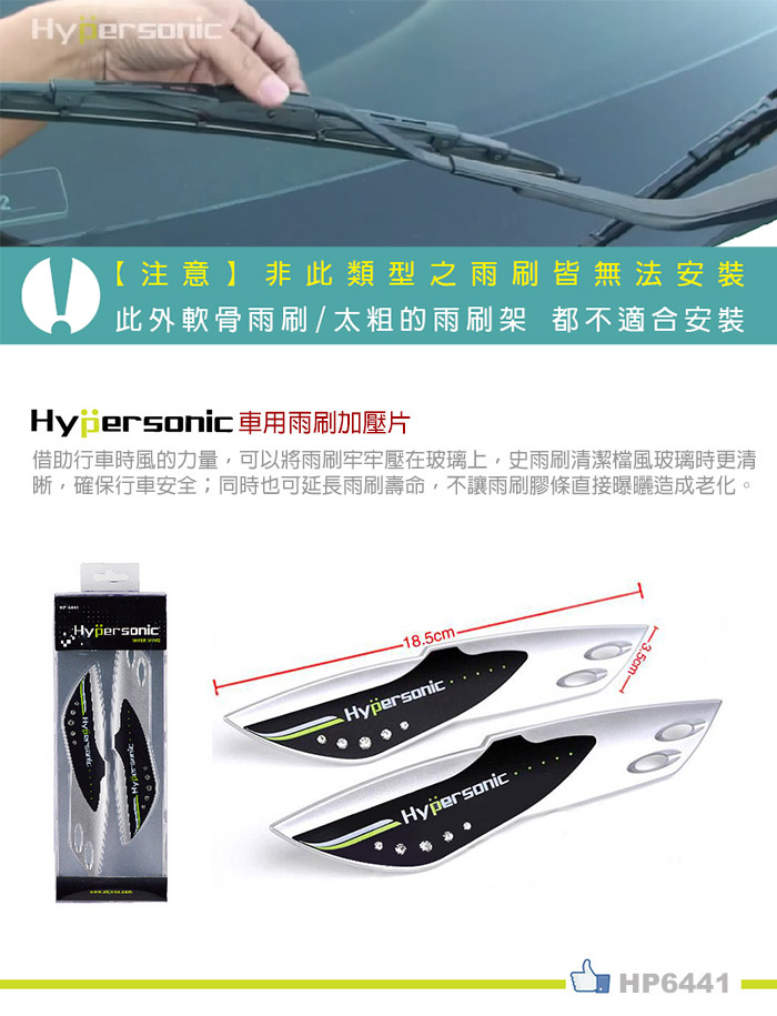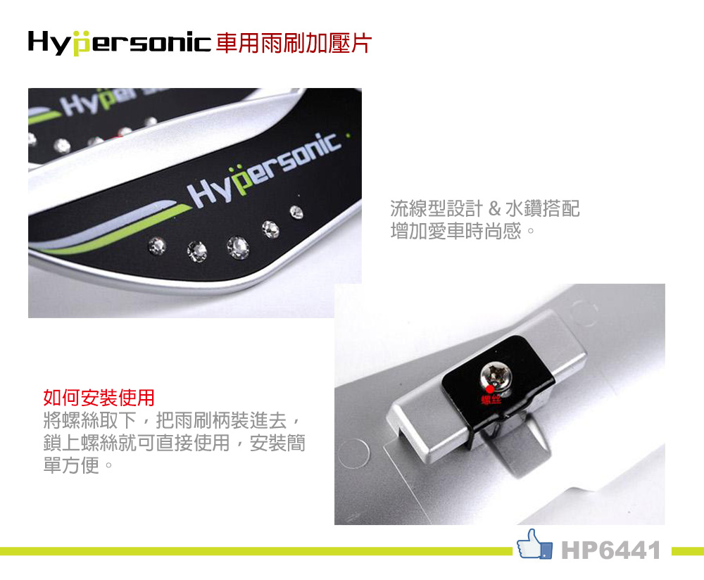 ‧ 品牌:Hypersonic‧ 品名:水鑽雨刷加壓片‧ 尺寸:185 x 35 x 13mm‧ 重量:82克‧ 顏色:銀色‧ 材質:ABS‧ 數量:1組2入‧ 產地:台灣