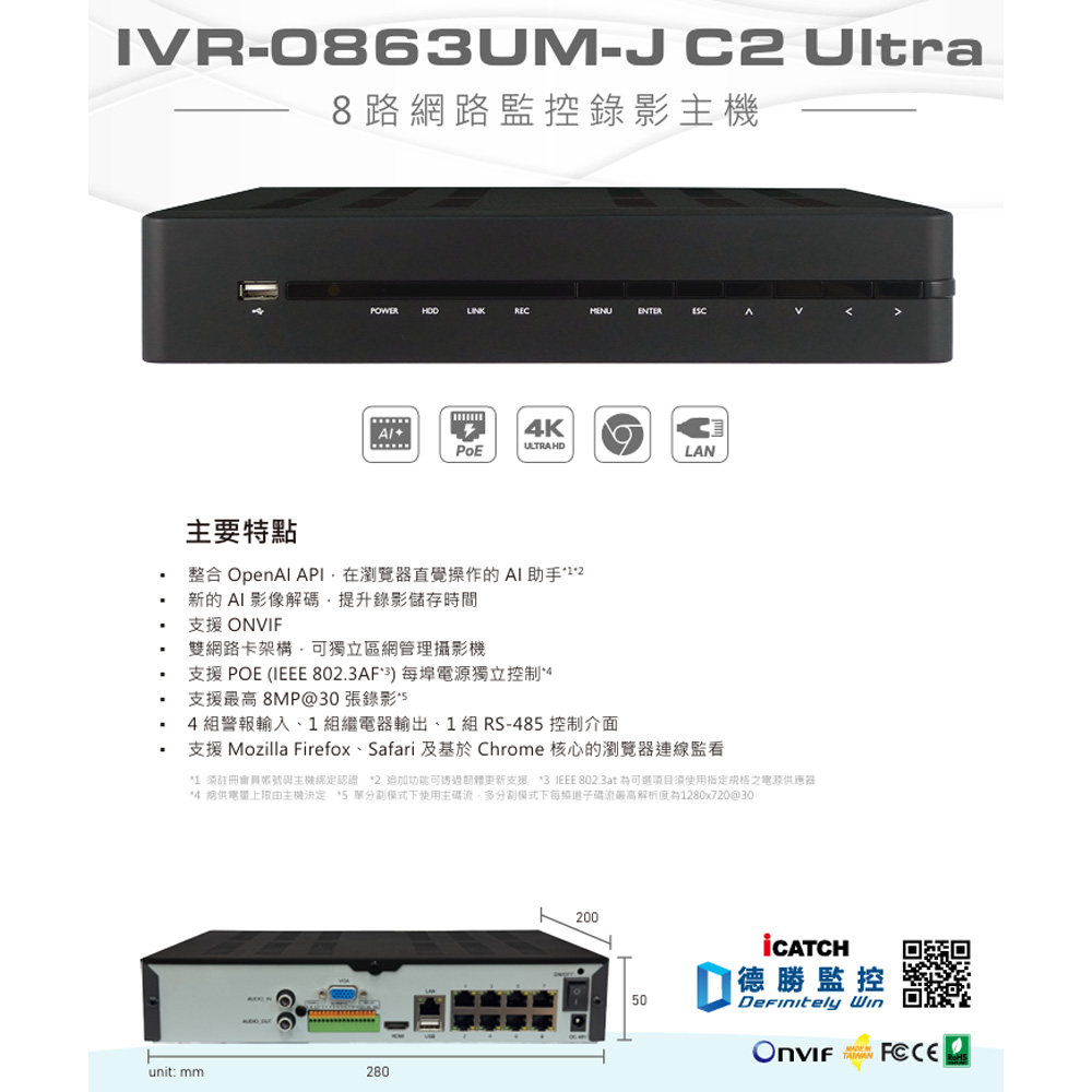 昌運監視器 ICATCH 可取 IVR-0863UM-J06C2U 8CH 4K 8路網路監控錄影主機