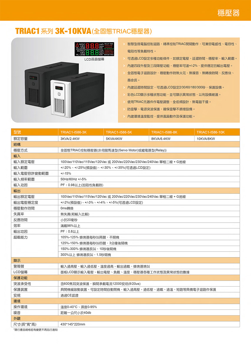 可透過LCD設定多種功能條件,如額定電壓、延遲時間、穩壓率、輸入範圍。