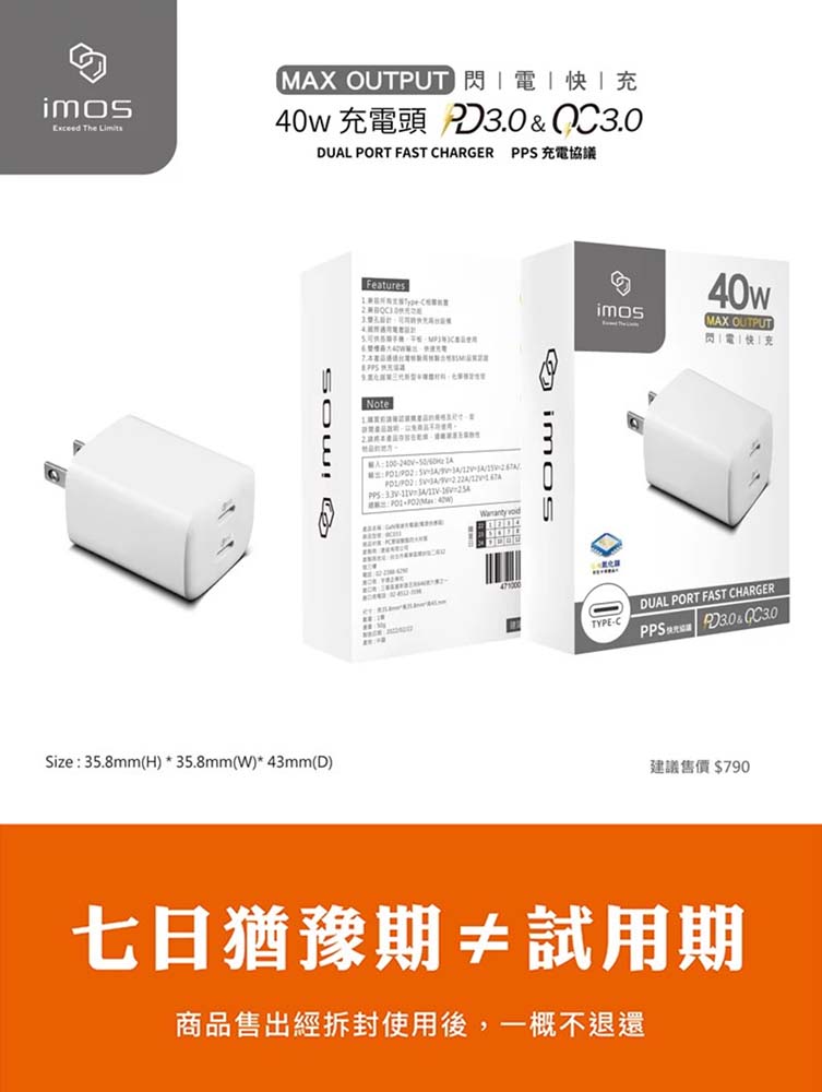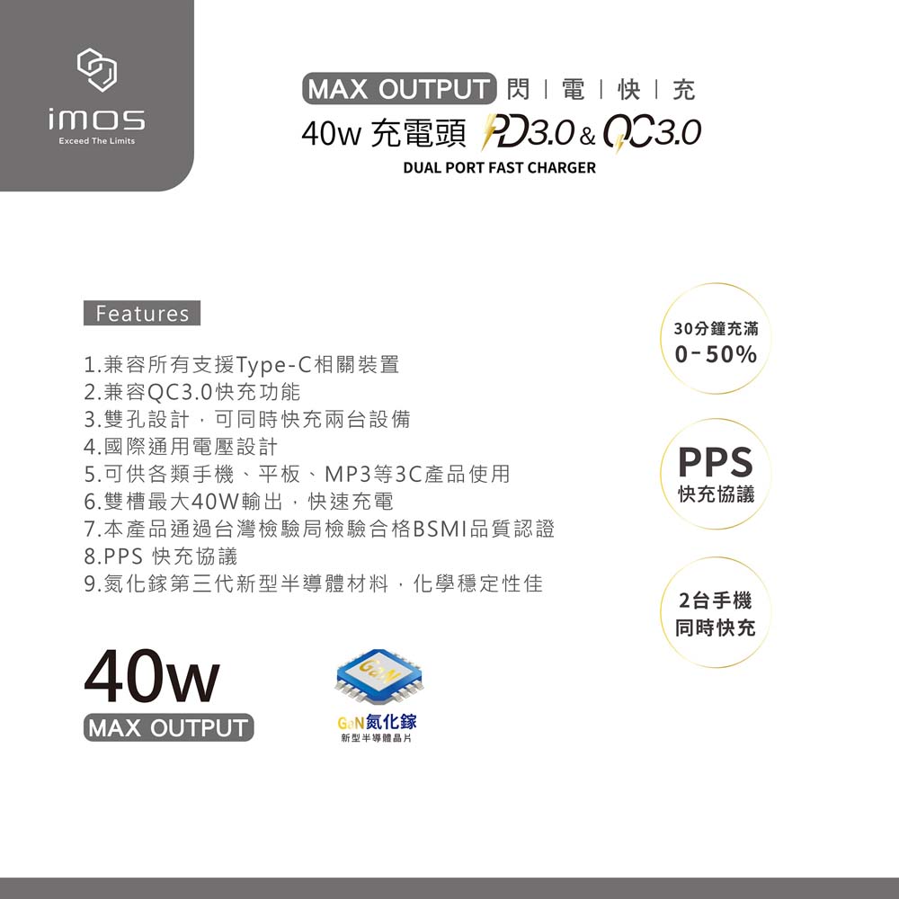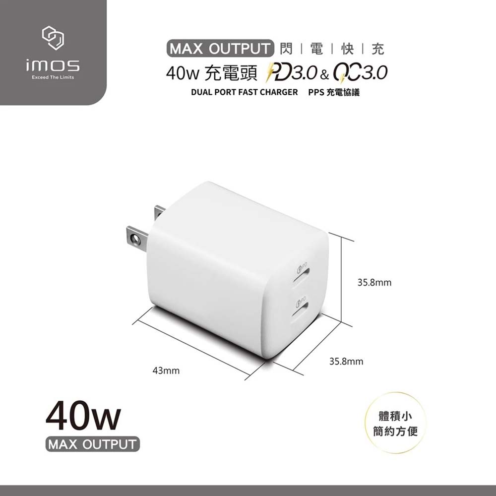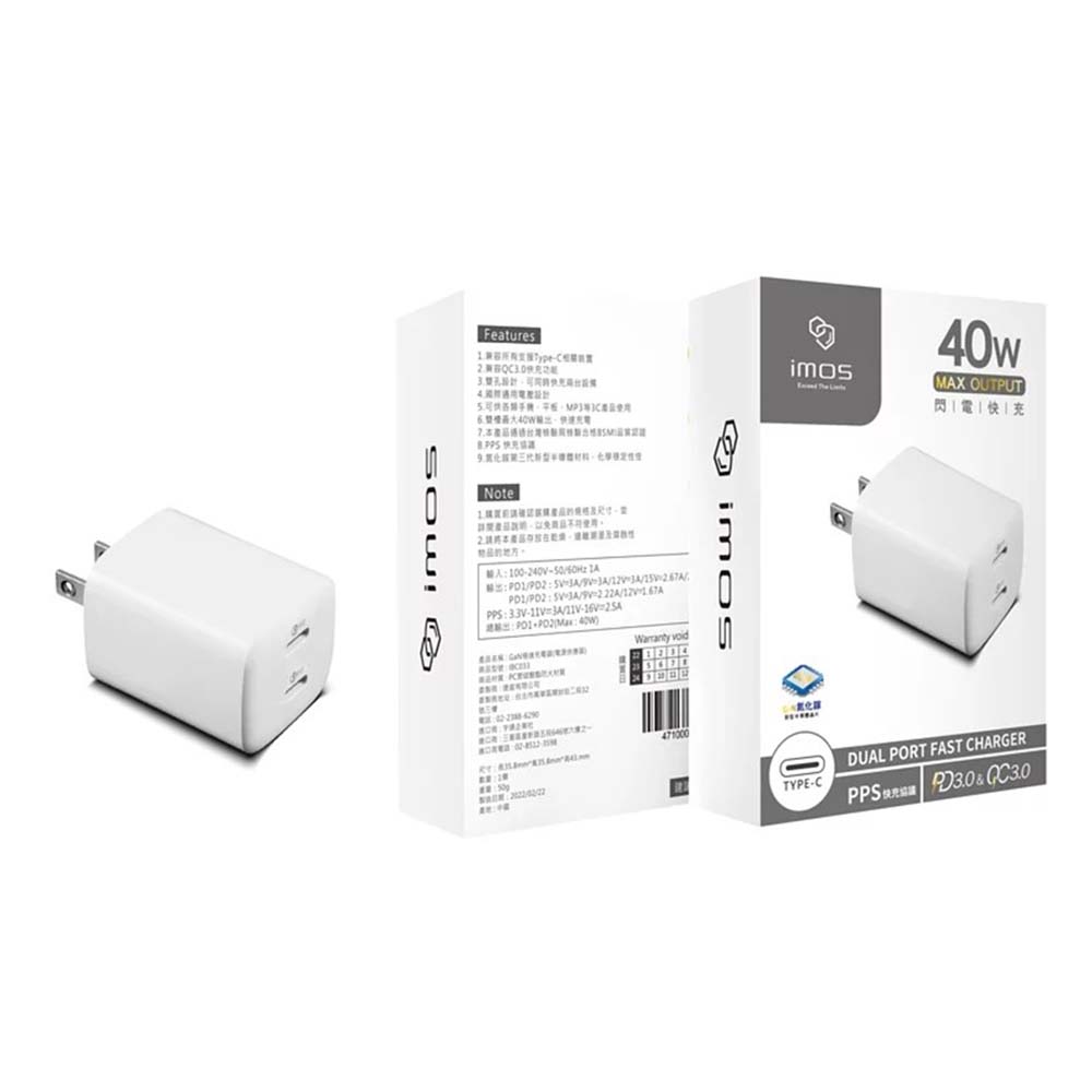 【山水之寶】支援i17快充 GaN氮化鎵極速充電器 iMos 40W PD+QC3.0雙孔 閃電充電器