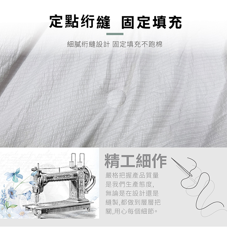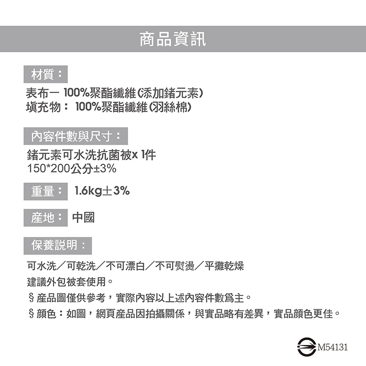 ★材質:表布-100%聚酯纖維(添加鍺元素)、填充物-100%聚酯纖維(羽絲棉)★產地:中國★內容件數與尺寸:數量:四季恆溫鍺元素可水洗抗菌被x1件尺寸:150x200cm±3%★網頁圖片因拍攝關係,與實品略有差異,實際顏色以出貨為主★產品圖僅供參考,實際內容以上述內容件數為主。★可水洗╱可乾洗╱不可漂白╱不可烘乾╱不可熨燙╱陰涼處晾乾★ ※建議使用洗衣袋清洗※不可使用柔軟精※建議可外加被套使用