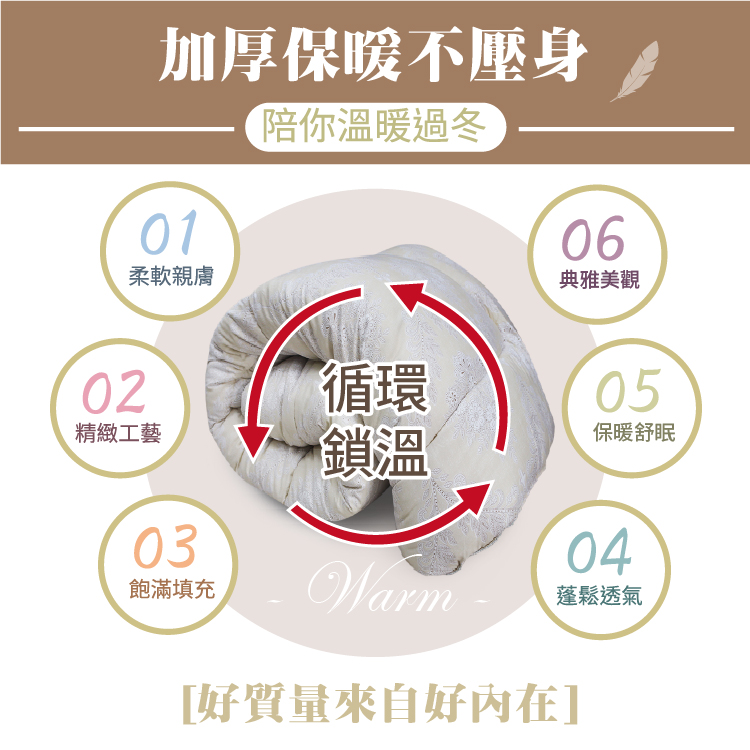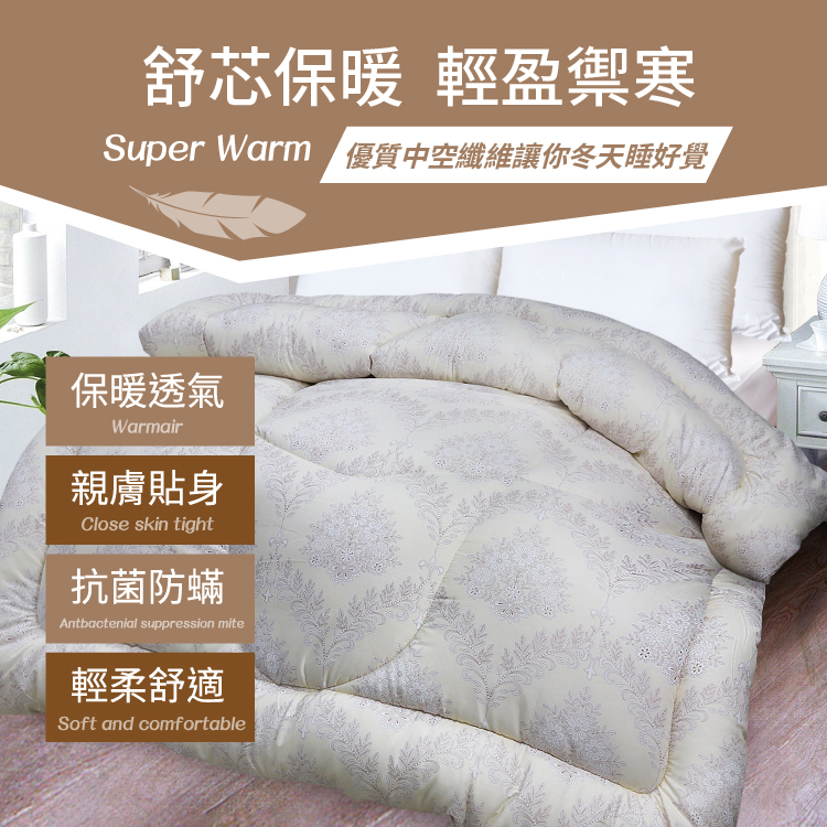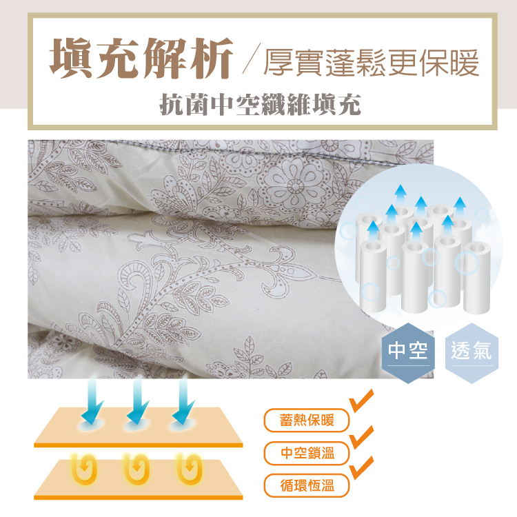 ★商品特色:*表布採用高質感舒適表布,質感細膩柔順,透氣不悶熱,舒適健康*原物料皆為台灣生產製造,並全程在台灣後製加工,過程絕對衛生安全*車格超膨鬆,牢牢固定填充物,舒服又溫暖,高級剪裁車工,作工細膩*內容物採用中空纖維棉,柔軟透氣,具有良好的蓬鬆彈性,觸感極為棉柔舒適*保暖,蓬鬆,抗菌,舒適好眠的最佳選擇