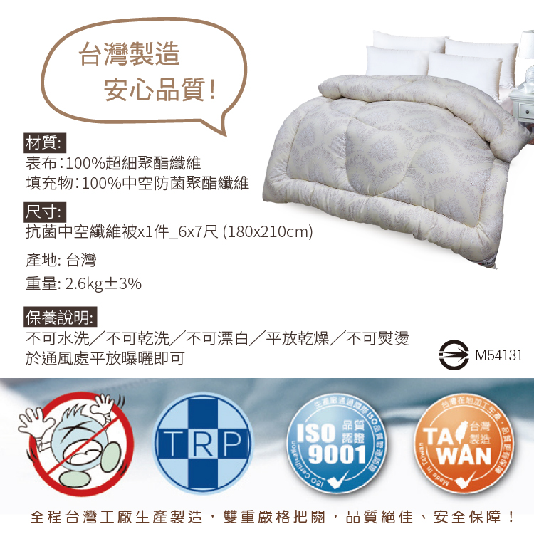 ★內容件數與尺寸: 抗菌中空纖維被x1件_6x7尺 (180x210cm) 重量2.6kg±3%