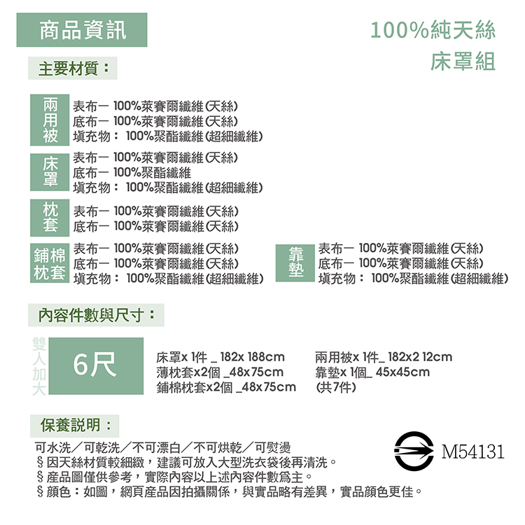 ★材質:兩用被表布-100%萊賽爾纖維(天絲)底布─100%萊賽爾纖維(天絲)填充物─100%聚酯纖維(超細纖維)