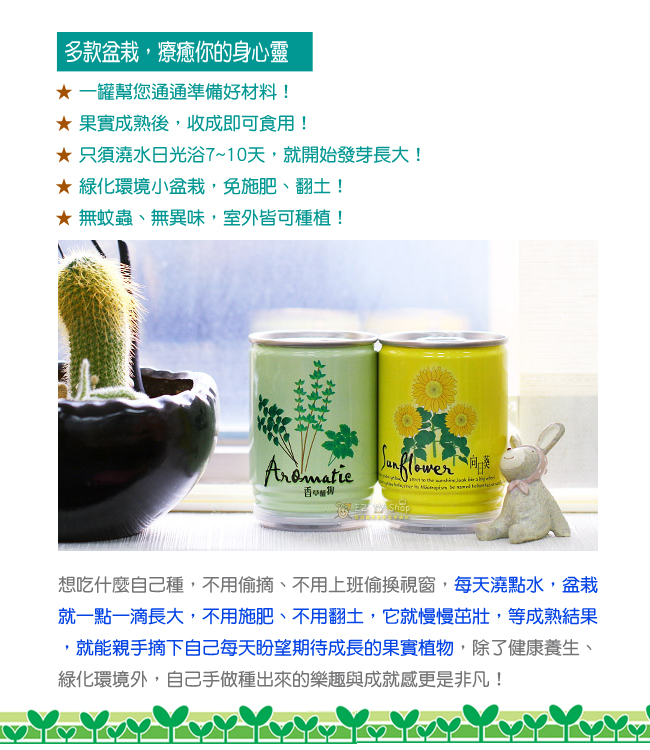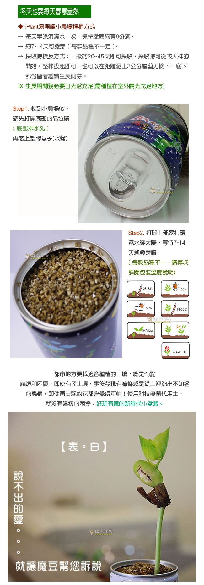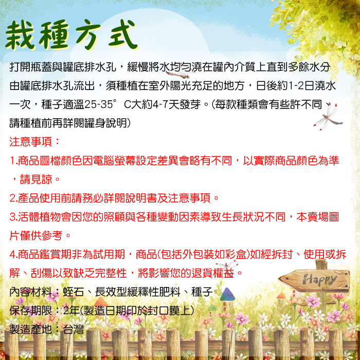商品內容:罐頭*1、蓋子*1(組裝後為水盆)、蛭石土壤、長效緩釋性肥料、種子數顆、使用栽培說明書