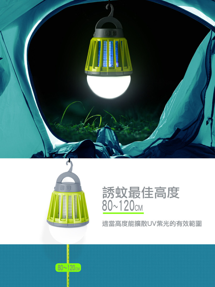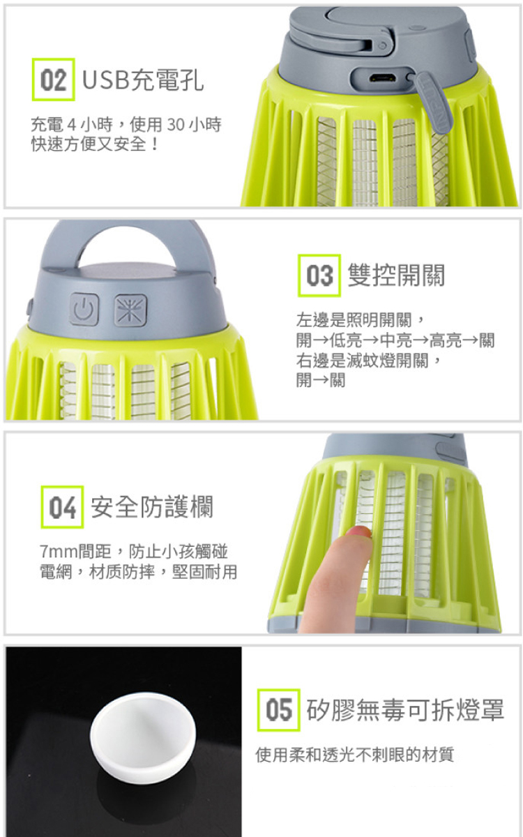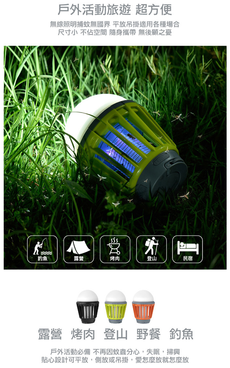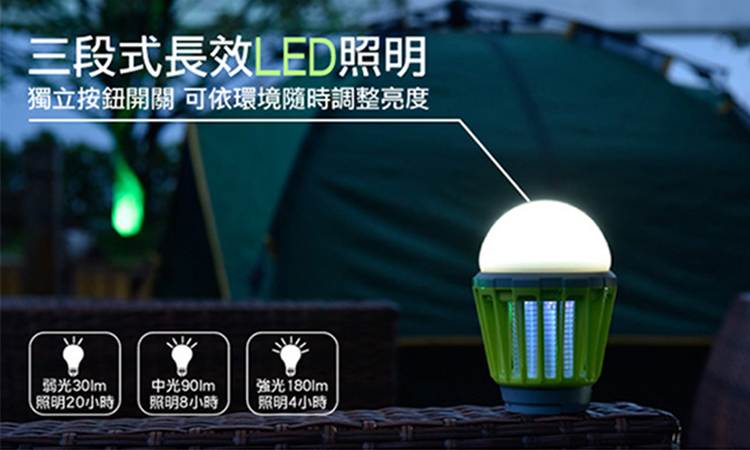 2. 三段LED照明切換 不只是捕蚊燈!內建三段式亮度調節 LED 燈,可依照場合切換為氛圍小夜燈、露營照明燈或緊急備用燈。