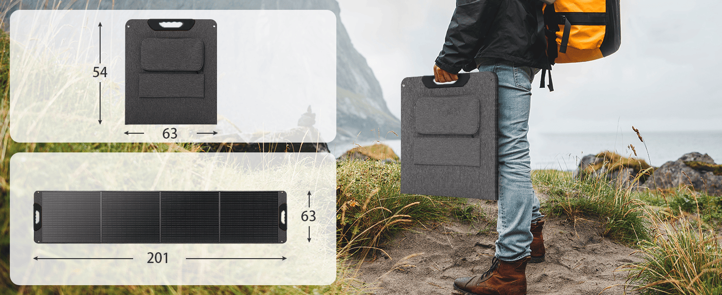 【便攜且易於使用】重量僅約 7 公斤,設計整齊折疊,面板高度便攜。 它可以輕鬆地運輸和設置在各種戶外設置,非常適合露營、露營車旅行、遠足,甚至作為家庭備用電源。 輕量結構確保易於操作,而不會影響性能。 【高能量轉換率】 200W 面板採用單晶太陽能電池,令人印象深刻的能量轉換效率高達 23.5%。【IP65 防水耐用】 太陽能電池板採用 IP65 防水等級設計,可承受各種環境條件。 它可以承受污垢,低壓水射流與強風,確保使用壽命長且耐用。