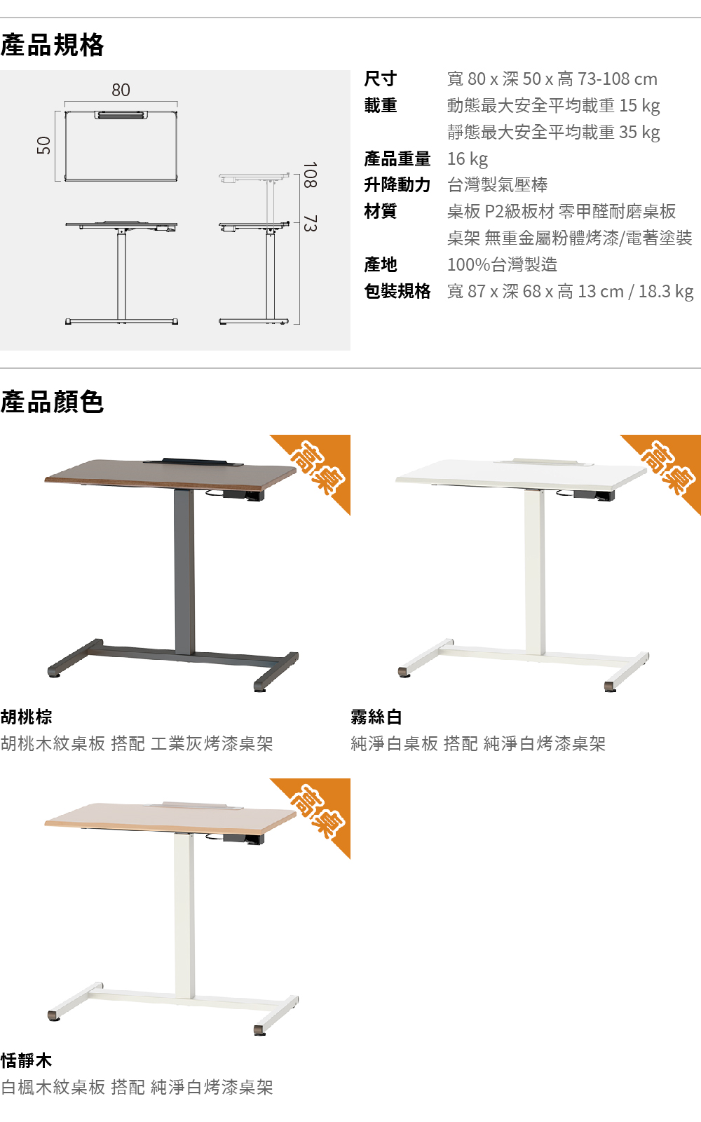 尺寸 寬 80 x 深 50 x 高 73-108 cm載重 動態最大安全平均載重 15 kg 靜態最大安全平均載重 35 kg產品重量 16 kg升降動力 臺灣製氣壓棒材質 桌板 P2級板材 零甲醛耐磨皮面板 厚度 1.8 cm 桌架 無重金屬粉體烤漆與電著塗裝產地 100%臺灣製造包裝規格 寬 87 x 深 68 x 高 13 cm / 18.3 kg