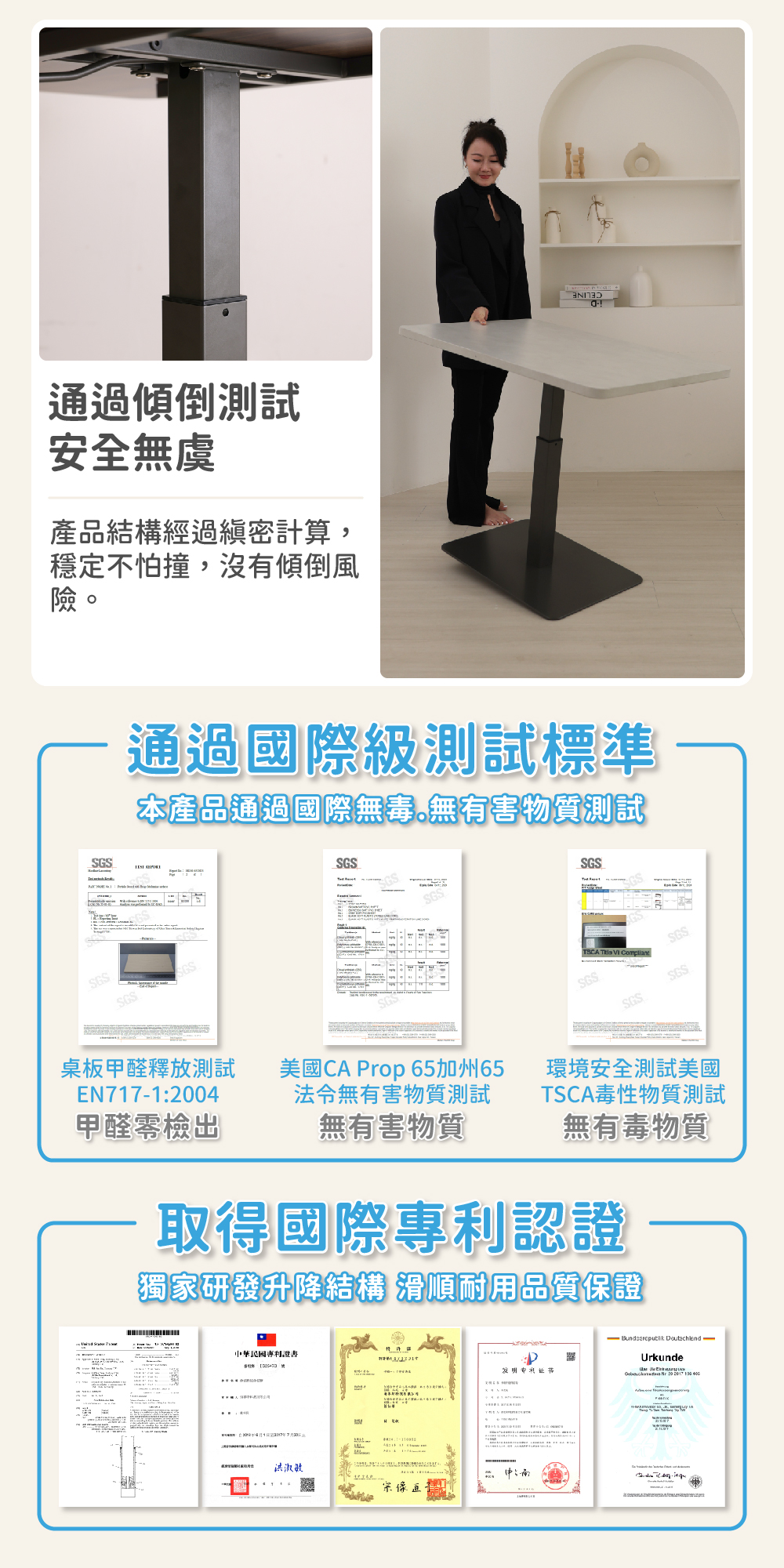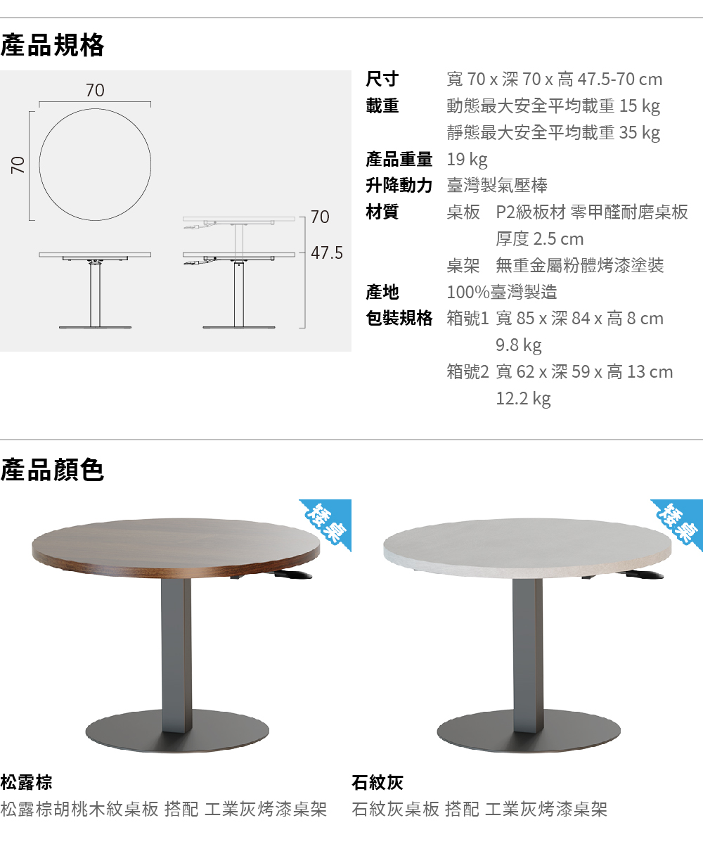 尺寸 寬 70 x 深 70 x 高 47.5-70 cm載重 動態最大安全平均載重 15 kg 靜態最大安全平均載重 35 kg產品重量 19 kg升降動力 臺灣製氣壓棒材質 桌板 P2級板材 零甲醛耐磨美耐皿板 厚度 2.5 cm 桌架 無重金屬粉體烤漆塗裝產地 100%臺灣製造包裝規格 箱號1 寬 85 x 深 84 x 高 8 cm / 9.8 kg 箱號2 寬 62 x 深 59 x 高 13 cm / 12.2 kg